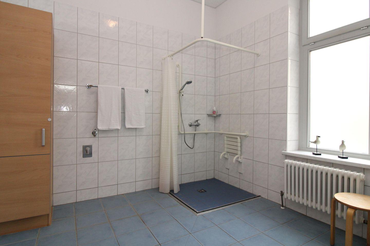 Das große und helle Badezimmer (mit Fenster / Tageslicht) verfügt über eine behindertengerechte und rollstuhlgeeignete (ebenerdige) Dusche, Waschbecken, WC, Föhn, Kosmetikspiegel, Hocker, einen geräumigen Badezimmerschrank sowie ausreichend sonstige Ablagemöglichkeiten.