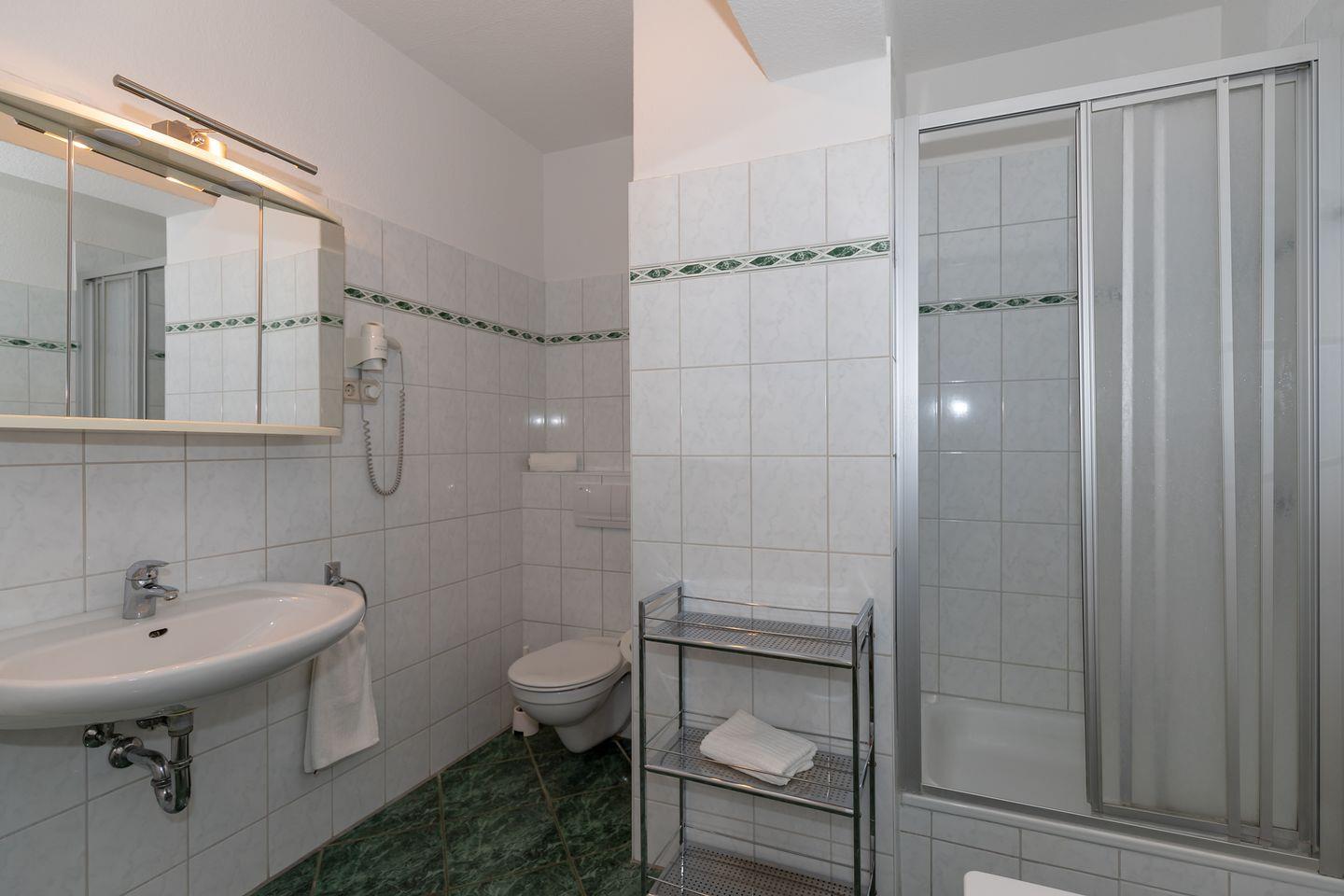 Das große und moderne Badezimmer verfügt über Dusche und Badewanne, Waschbecken mit Spiegelschrank, WC, Handtuch-Heizkörper sowie ausreichend Ablagemöglichkeiten.