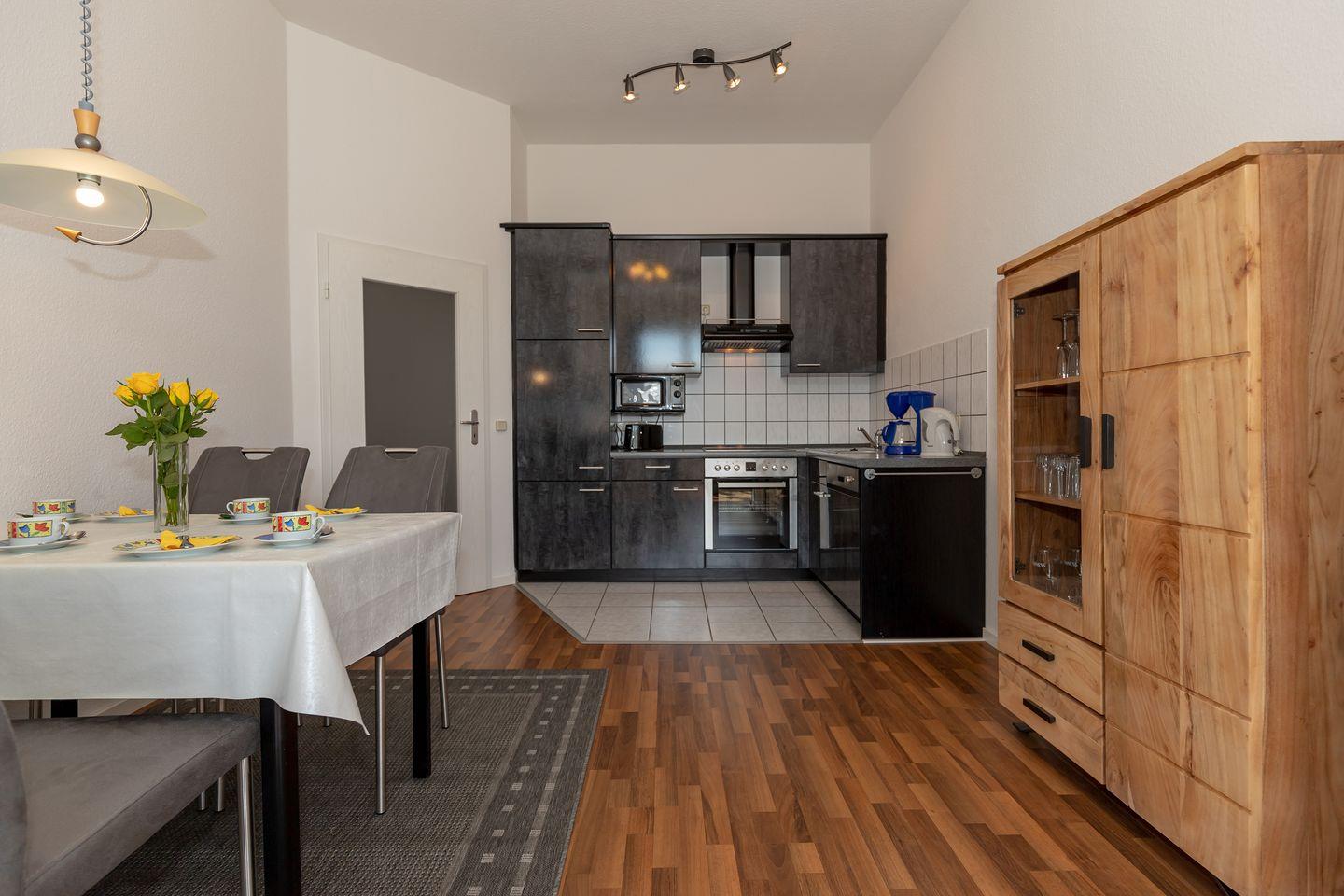 Der an den Essbereich angrenzende offene Küchenbereich beinhaltet eine komplett aus-gestattete Einbauküchenzeile mit 4-Zonen-Ceran-Kochfeld, Dunstabzug, Backofen und Mikrowelle, Kühlschrank mit Gefrierfach, Geschirrspülmaschine, Kaffeemaschine, Wasserkocher und Toaster. Die Küche ist mit Geschirr, Gläsern, Besteck und Töpfen bestens und vollständig ausgestattet.