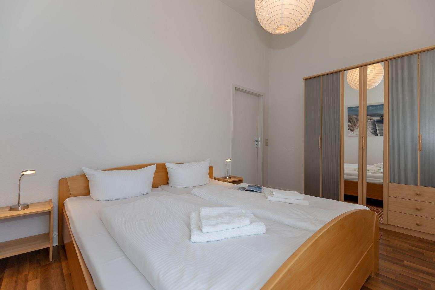 Das freundliche Schlafzimmer ist mit einem bequemen Doppelbett, Nachttischen sowie einem geräumigen Kleiderschrank eingerichtet. Eine zusätzliche bequeme Schlafmöglichkeit für eine weitere 3. bzw. 4. Person bietet die ausziehbare Schlafcouch im Wohnzimmer.