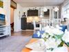Wohnzimmer mit Schlafcouch, Sessel, Esstisch, Kabel-TV und Radio