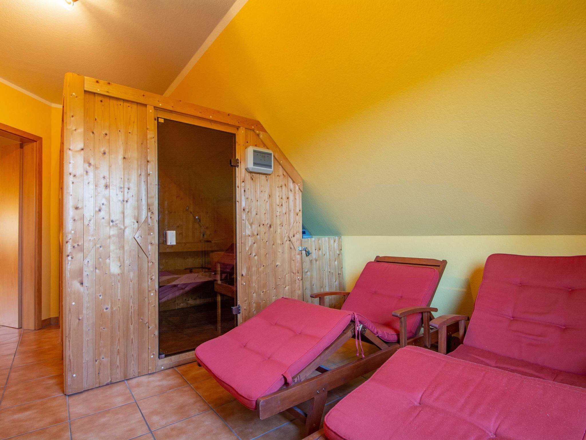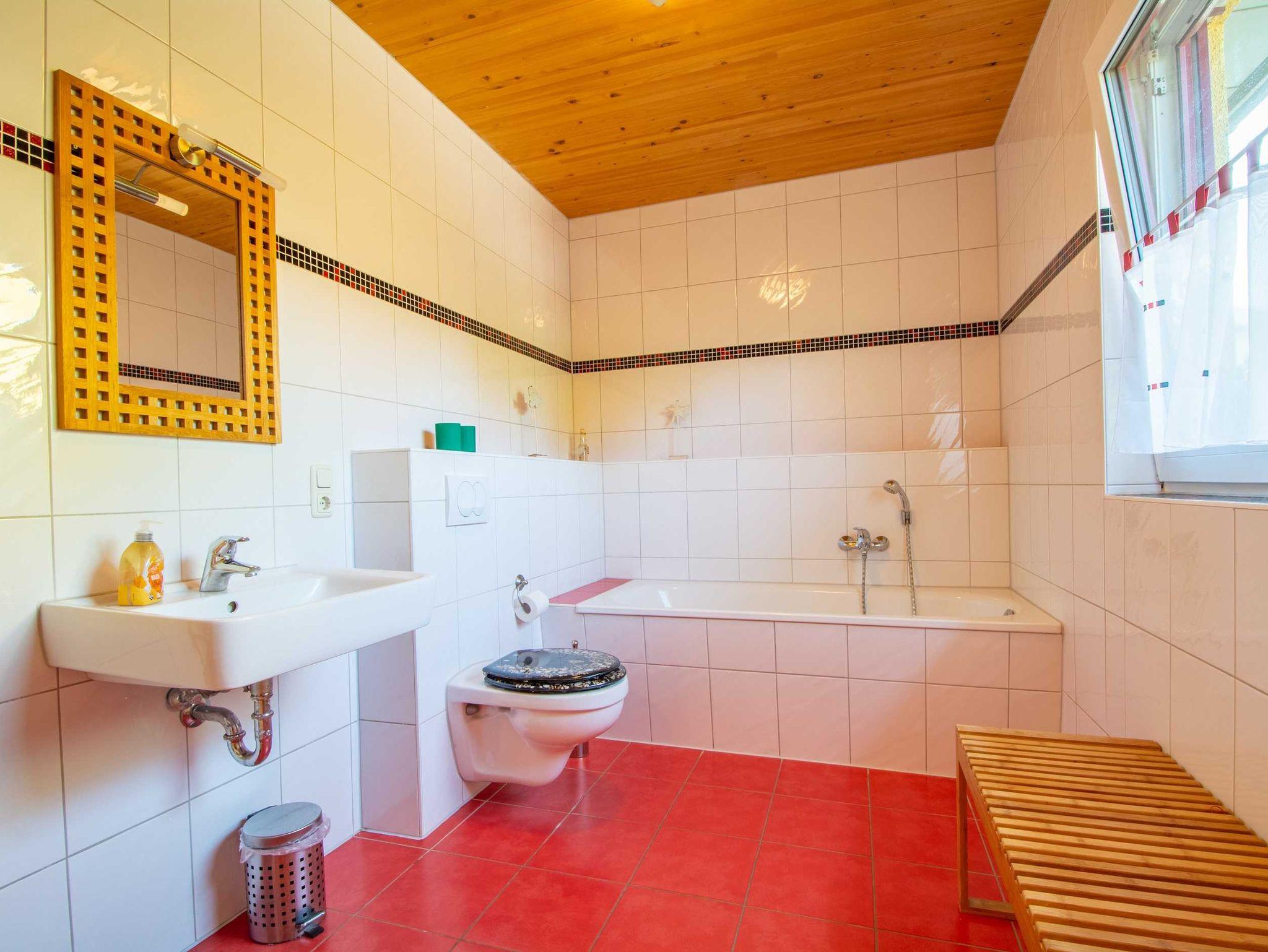 Das geflieste Tageslichtbad im Obergeschoss ist ausgestattet mit einer Dusche, Waschbecken und WC. Im Erdgeschoss lädt ein Wannenbad zur Entspannung ein. Des Weiteren gehört zur komfortablen Ausstattung ein Sauna- und Ruheraum (mit TV-Gerät), dessen Nutzung sich inklusive versteht.