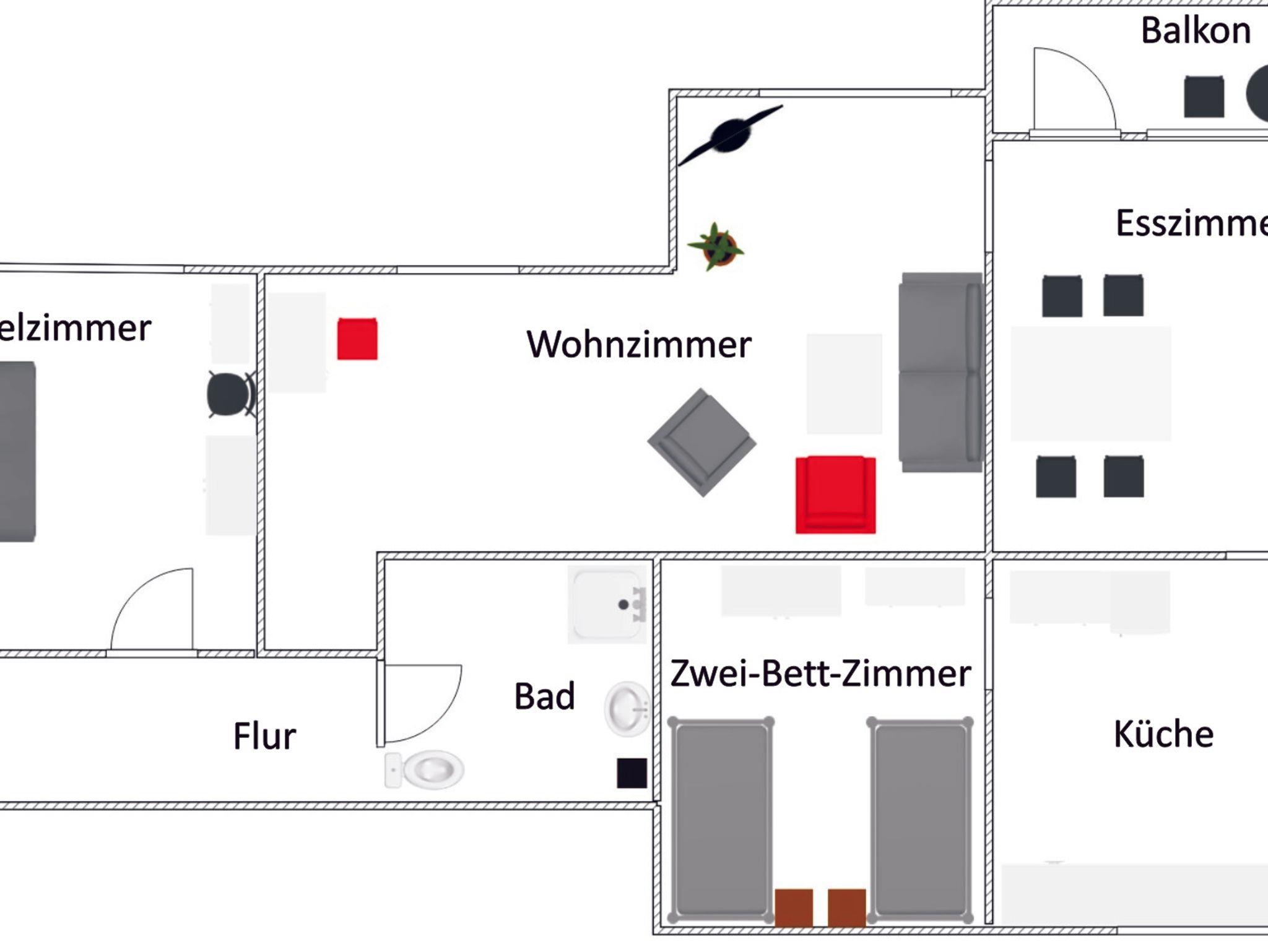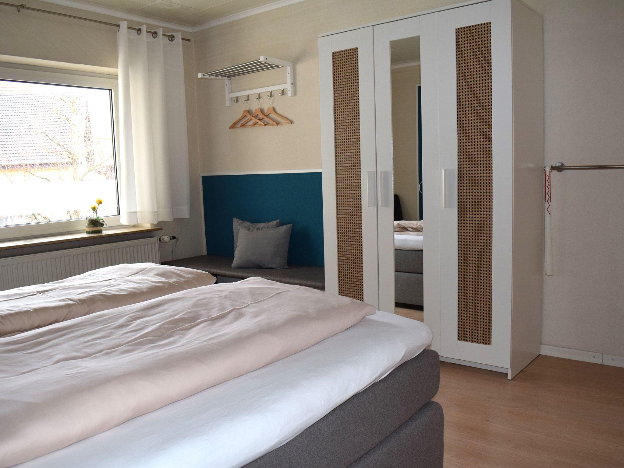 In der lichtdurchfluteten, neu renovierten 100 qm Wohnung befindet sich ein großes Wohnzimmer mit bequemem Sofa und Relaxsessel, Wohnzimmertisch, TV sowie ein kleiner Schreibtisch. Der Blick aus dem Fenster des Schlafzimmers mit Boxspringbett, 180 x 200cm, einer Garderobe, Kleiderschrank und Stuhl, geht auf unseren Lindenbaum. Klein jedoch hell ist das Schlafzimmer mit 2 Einzelbetten, Nachttisch, Kleiderschrank und Garderobe. Die Betten sind bei Ihrer Ankunft bereits bezogen.