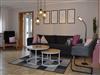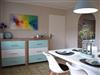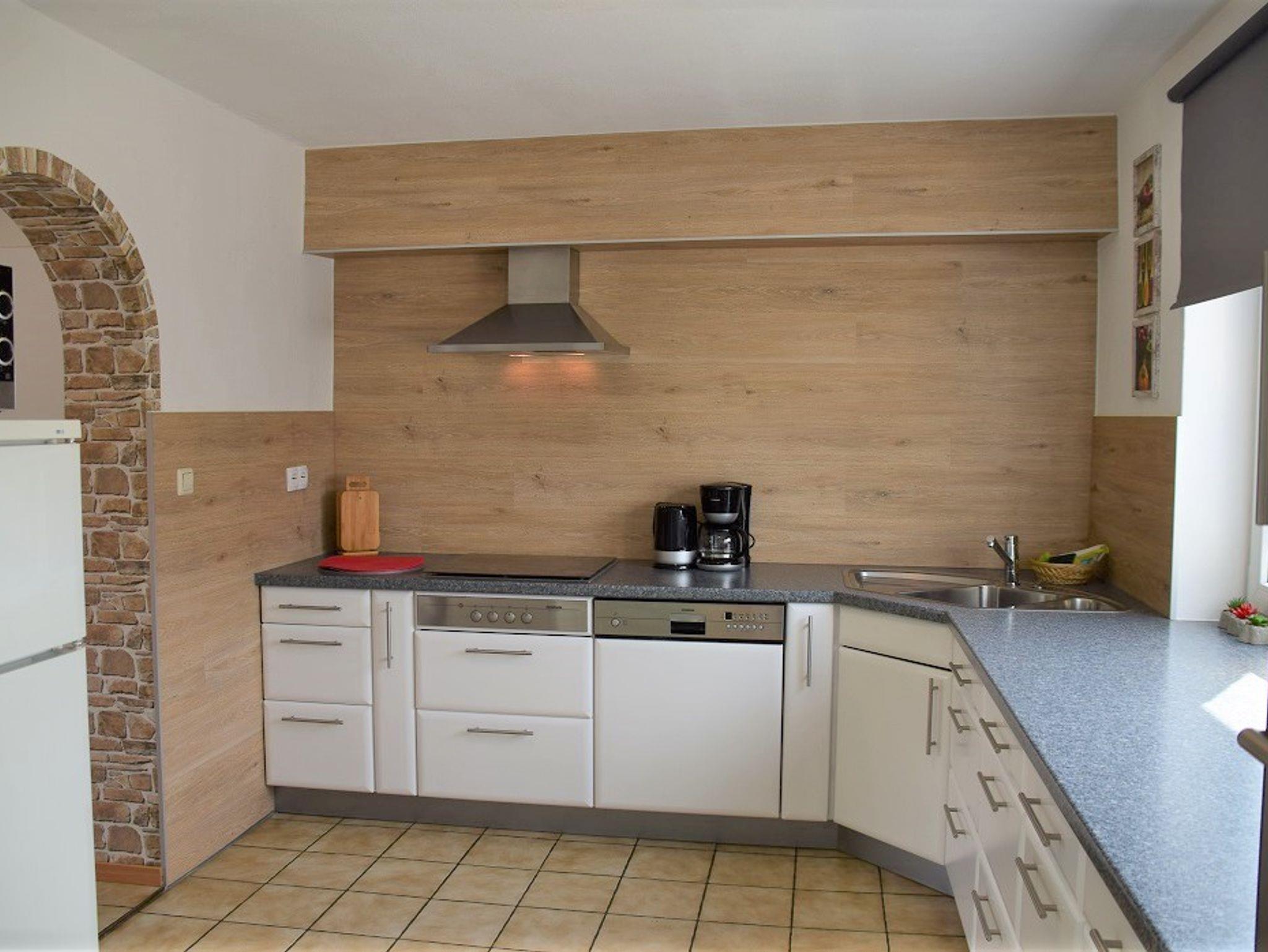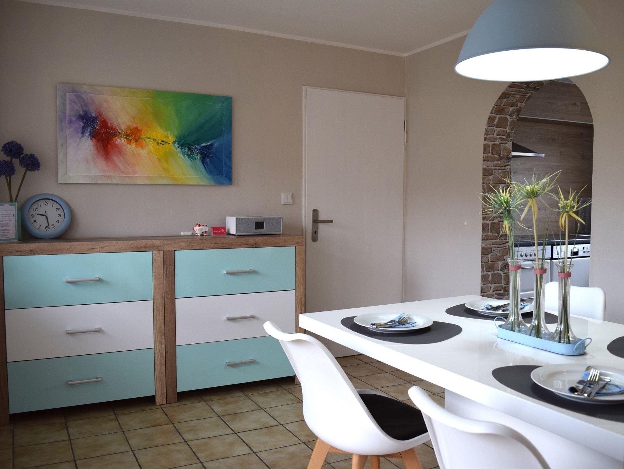 Die moderne große Küchenzeile ist mit einer Kaffeemaschine, Wasserkocher, Eierkocher, Toaster, Kühlschrank, Mikrowelle, Backofen, Besteck, Schüsseln, Töpfen, Pfanne, Geschirr uvm. voll ausgestattet. Das Esszimmer im modernen Stil macht das Apartment komplett.