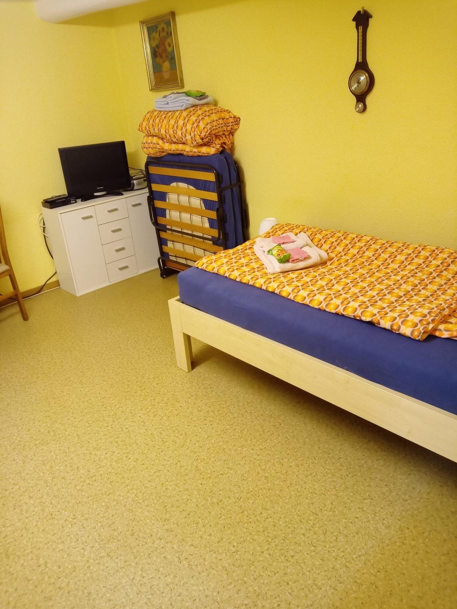 Die hier gebotene Ferienwohnung verfügt über ca. 18m² Wohnfläche bestehend aus einem Zimmer, mit integriertem Küchenbereich und einem kleinen Bad. Sie befindet sich im Kellergeschoss eines Wohnhauses und bietet festen Schlafplatz für 2 Personen. Im Zimmer befinden sich zwei Betten 1 x stabiles Holzbett 100 x 200 cm und ein Klappbett 90 x 200 cm (für ein Klappbett sehr bequem mit verstellbarem Kopfteil). Durch das Klappbett lässt sich eine Menge Platz sparen und es kann egal wo im Raum aufgestellt werden (siehe Fotos).