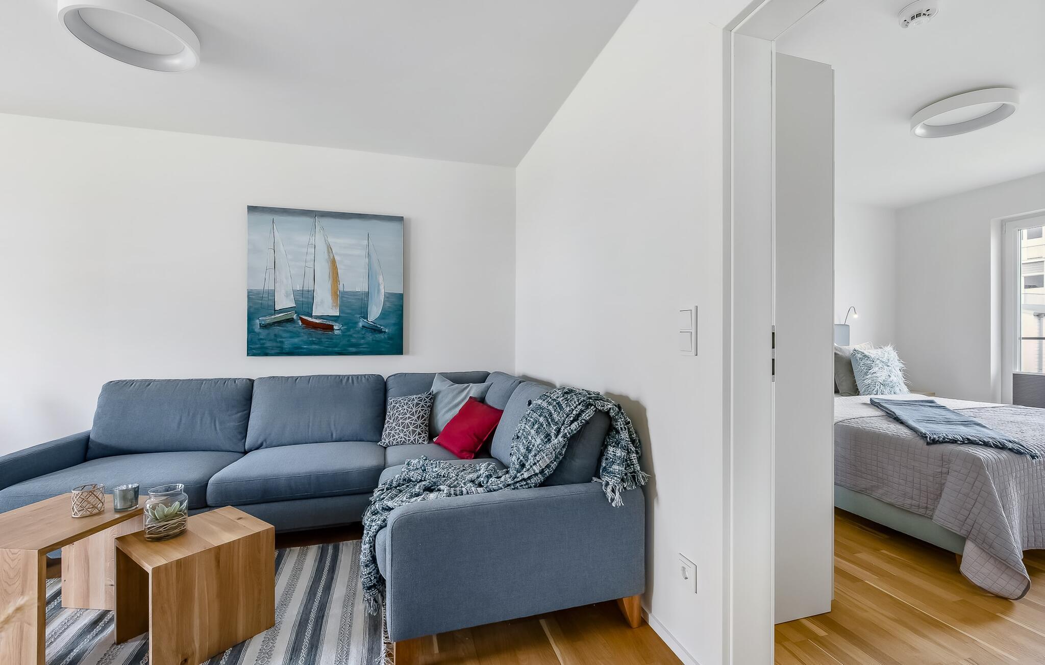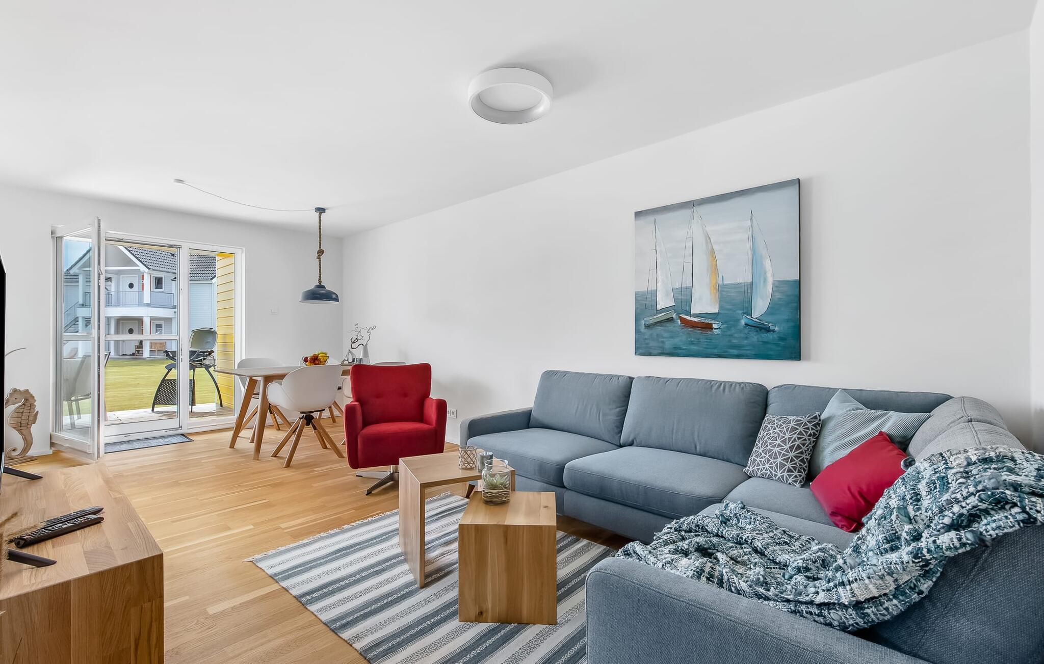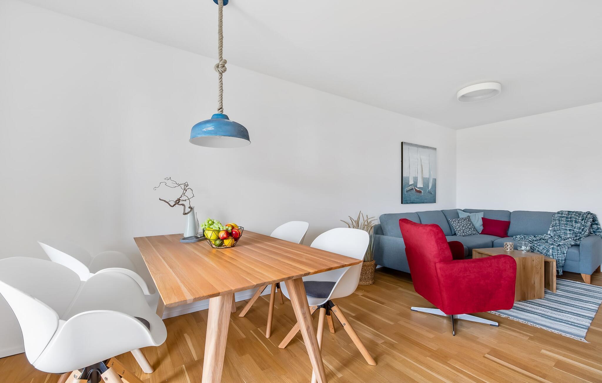 Das KÜSTENKIND ist eine großzügig geschnittene Ferienwohnung im Erdgeschoss, die ihr direkt über zwei Terrassen betreten könnt. Entspannter kann ein Sommerleben nicht sein. Im nordisch-maritimen Stil eingerichtet, strahlt jeder Raum Gemütlichkeit aus. Der offene Wohn- und Essbereich mit angrenzender Küche besticht durch die bodentiefen Fensterelemente und den Blick in die Ferne. Sowohl von der Küche als auch vom Wohnraum gelangt man auf die zweite Terrasse, wo es sich genüsslich speisen und entspannen lässt.