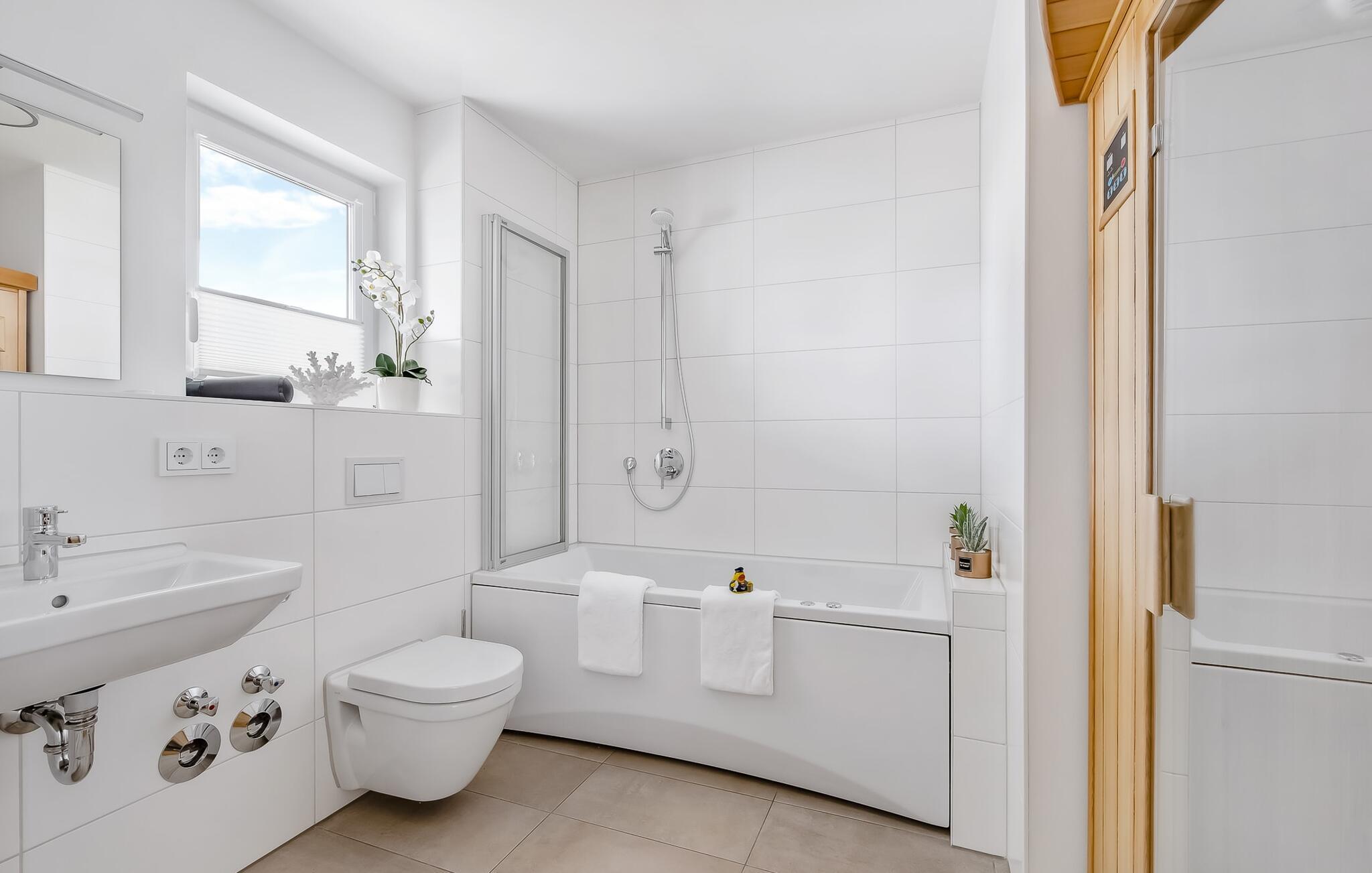 Eine weitere Wohlfühloase ist das Badezimmer mit einer Infrarotsauna und einer Whirlrelaxwanne, die ebenfalls über eine Duschvorrichtung verfügt.