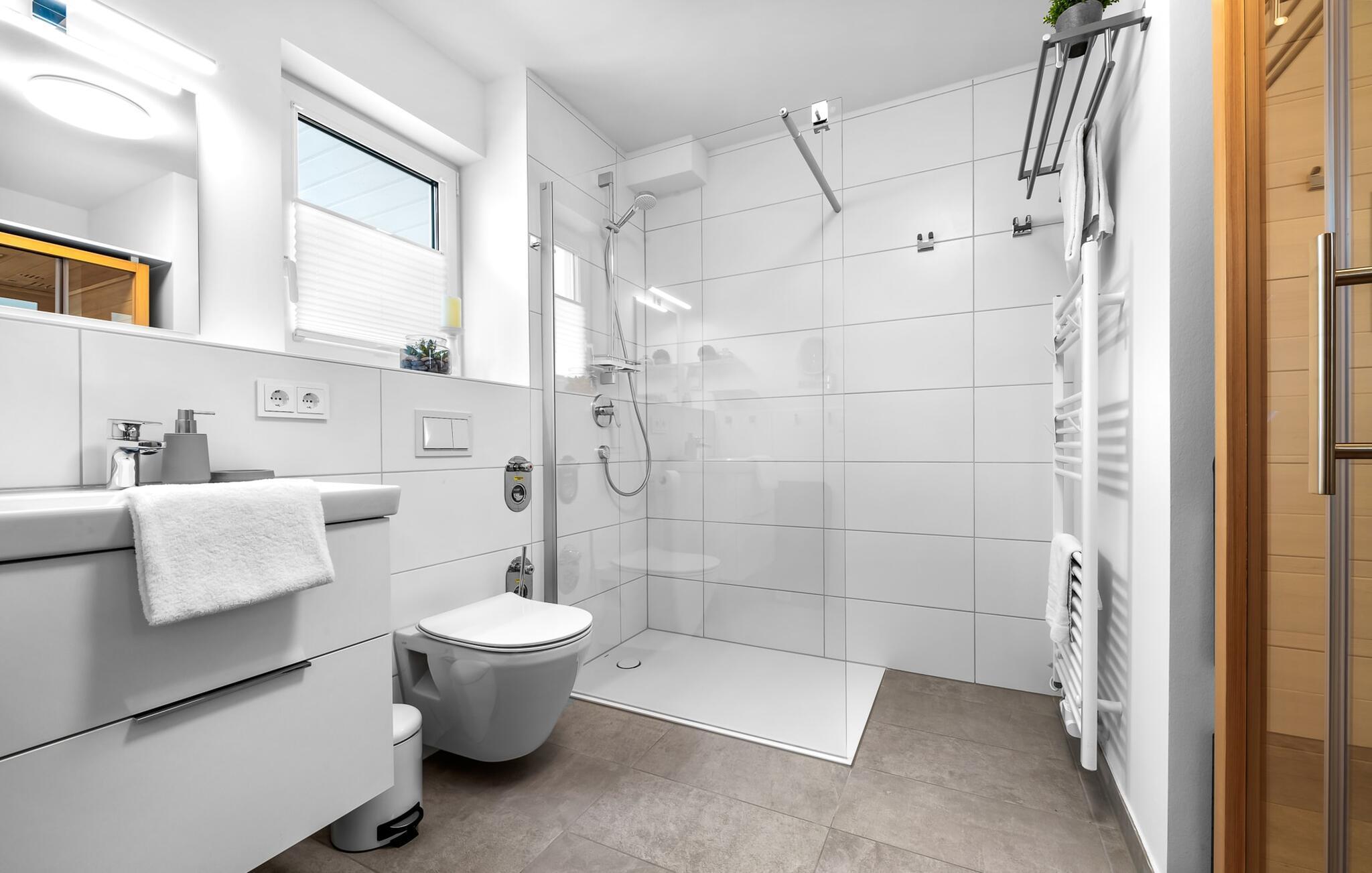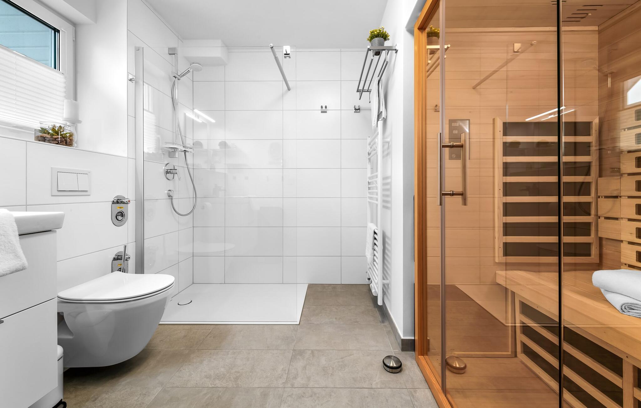 Die Wohnung verfügt über zwei komfortable Schlafzimmer, die Ruhe und Erholung garantieren. Der Komfort wird im Bad durch bodengleiche Dusche und eigener Infrarotkabien abgerundet.