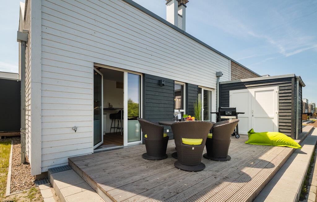 Entspannen Sie an warmen Sommertagen auf der Terrasse direkt am Wasser. Hier können Sie gemütlich frühstücken und auf dem Grill leckere Mahlzeiten zubereiten.