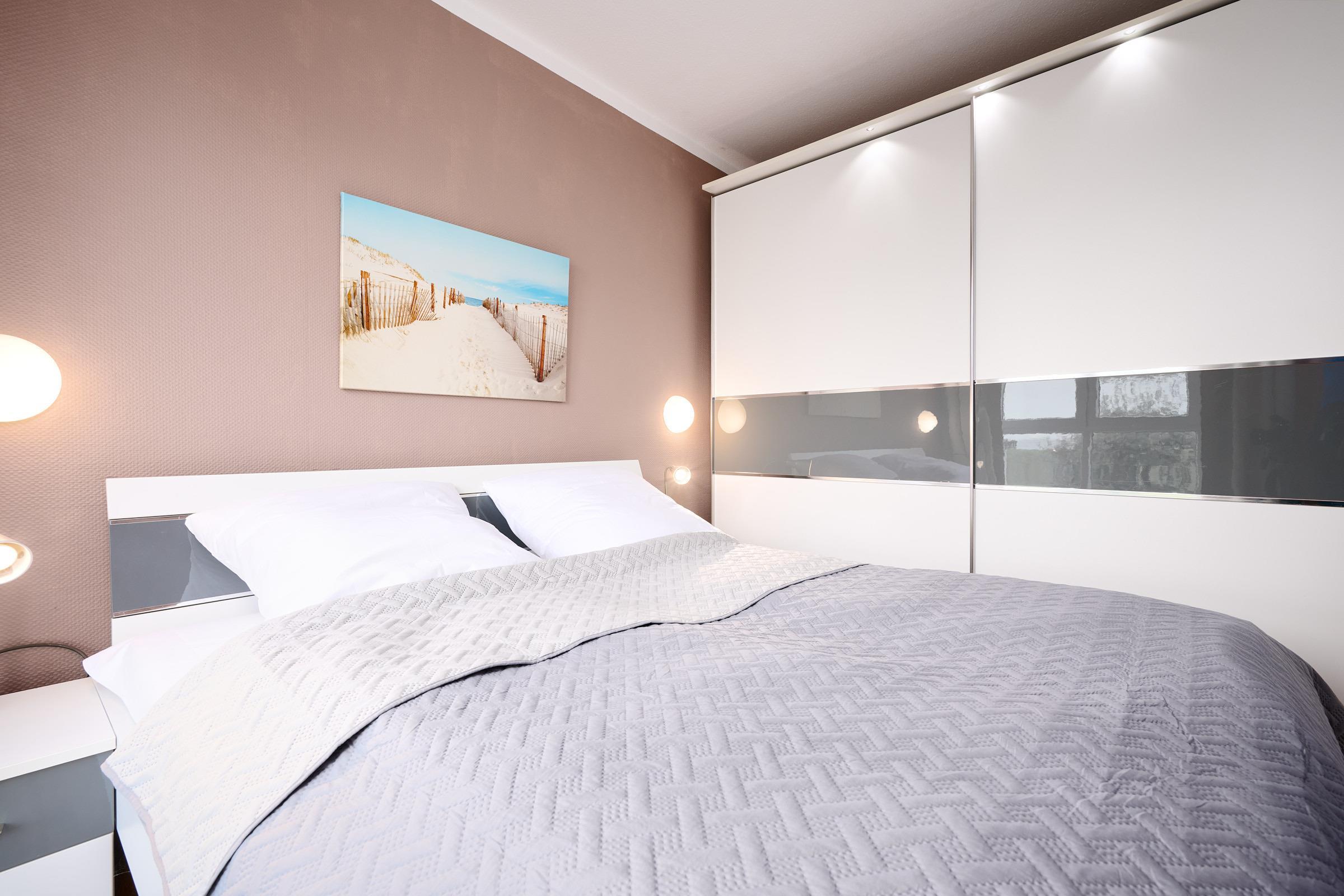 Schlafzimmer: Doppelbett (160 x 200 cm), Kleiderschrank, Platz für ein Babybett vorhanden