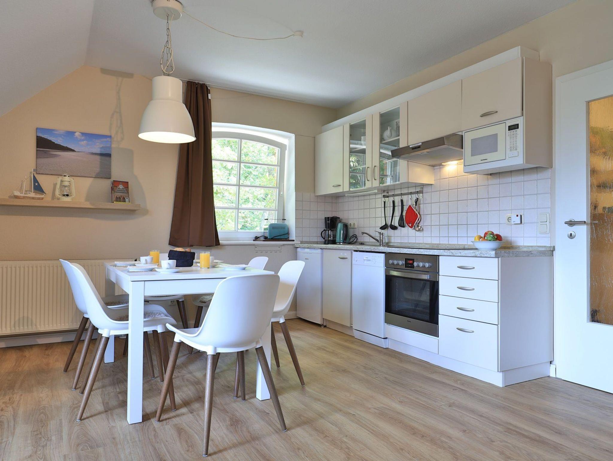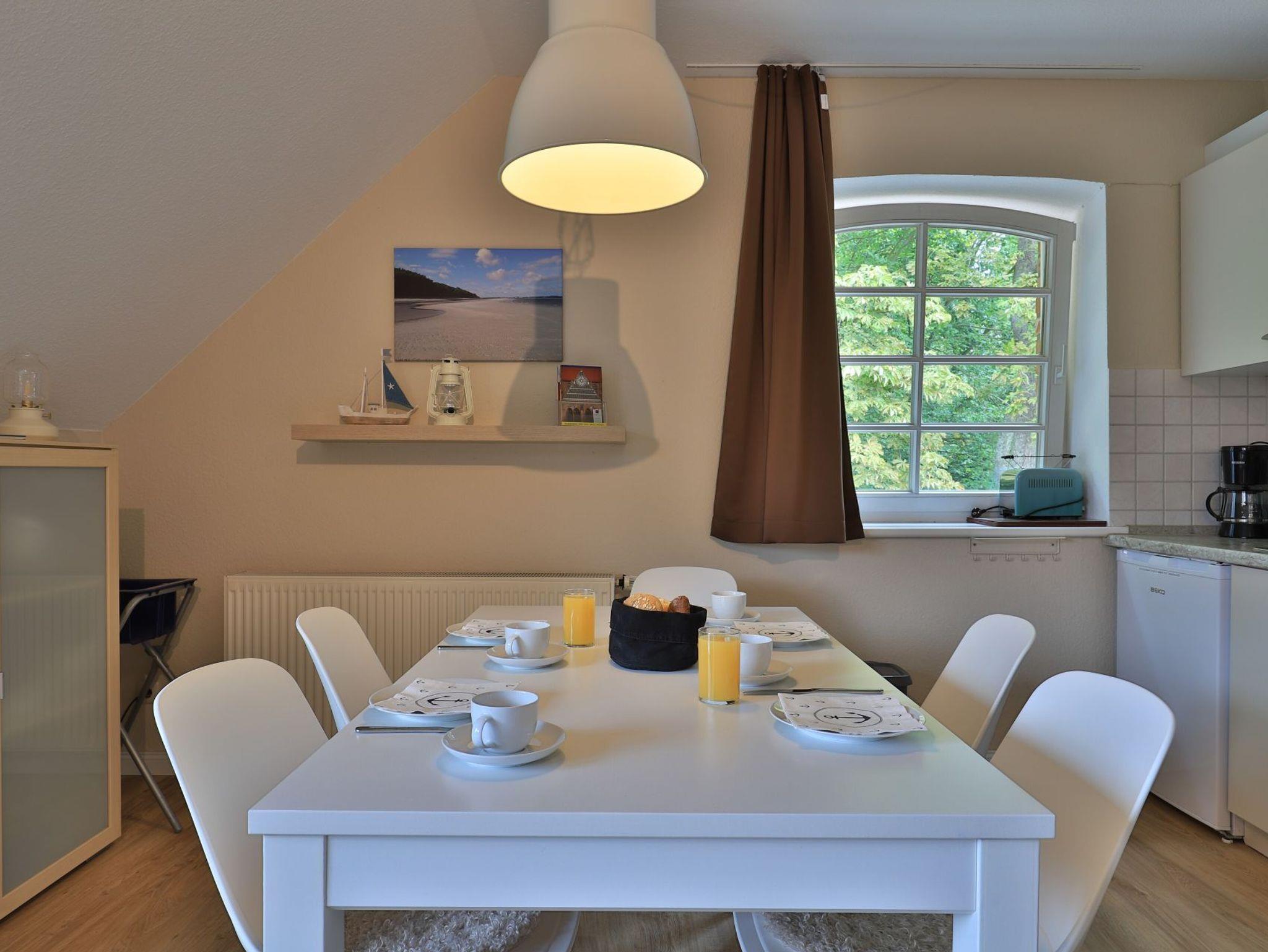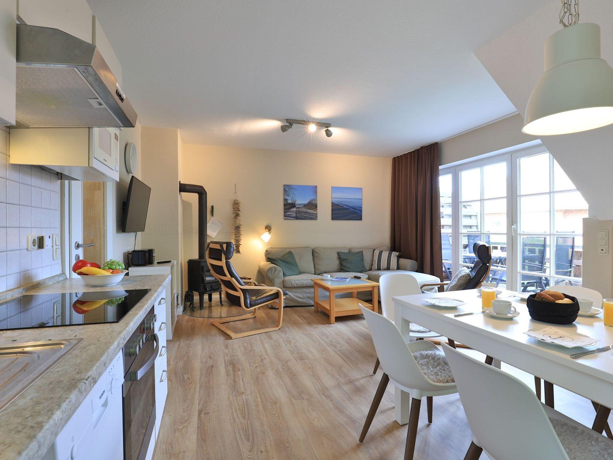 Die geräumige Wohnfläche von 65qm empfängt Sie mit einem behaglich eingerichteten Wohn-/Essbereich mit Kaminofen, Sofa, Lesesessel, Flachbild TV, Musikanlage sowie Balkon. Am großen Esstisch nehmen Sie Ihre Mahlzeiten ein, die Sie zuvor in der gut ausgestatteten Wohnküche zubereitet haben.