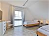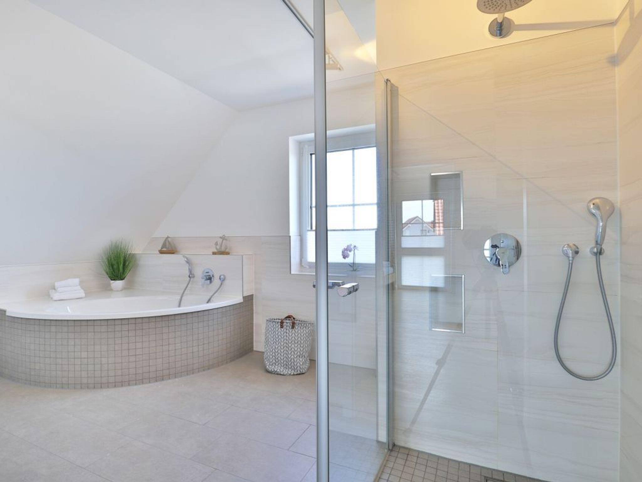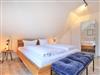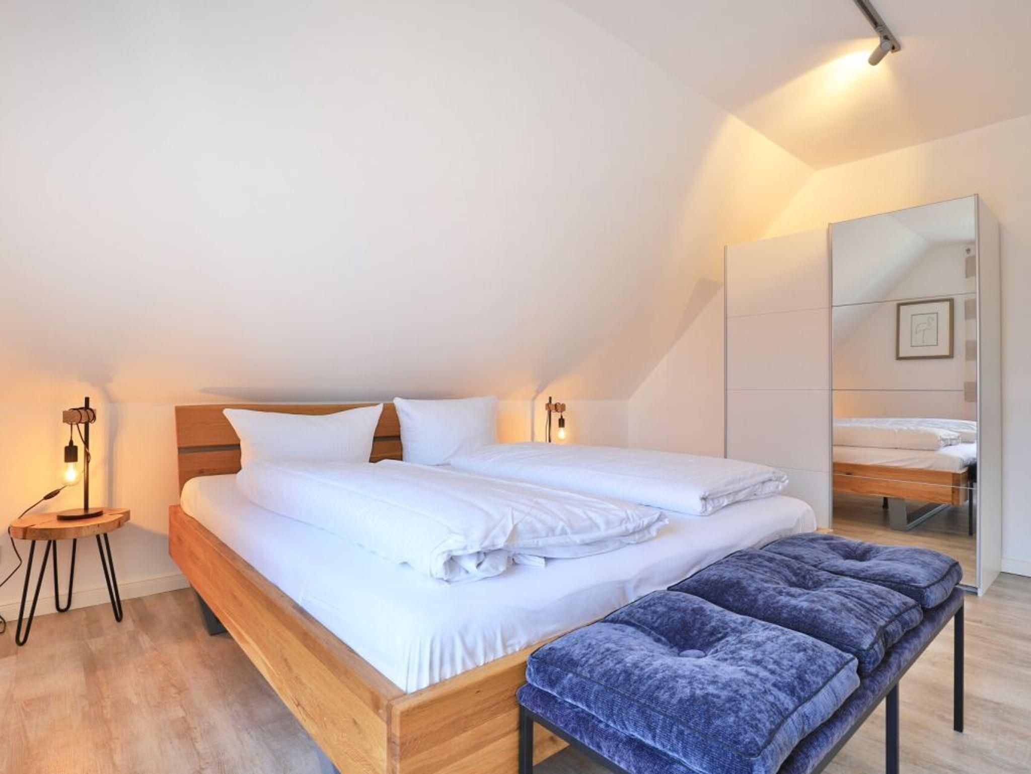 Über eine Treppe im Eingangsflur gelangen Sie in die obere Etage, wo sich zwei weitere Komfort Schlafzimmer befinden. 1x mit Doppelbett, Kleiderschrank, TV sowie Balkonzugang mit Blick über die Felder, 1x mit zwei Einzelbetten, Kleiderschrank und TV. Idealerweise besitzt auch diese Etage ein großzügiges Tageslicht Badezimmer mit Eckbadewanne, bodengleicher Dusche, zwei Waschtische und WC.