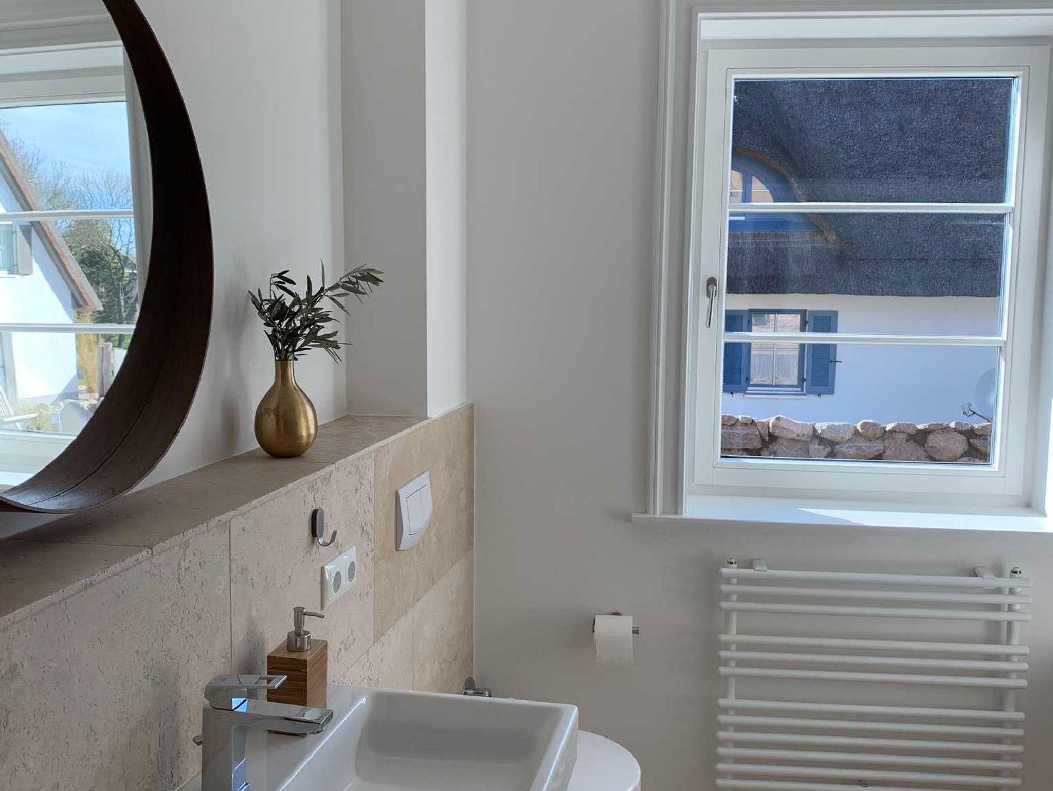 gemütliche und entspannende Stunden. Das Badezimmer mit Waschtisch, großer