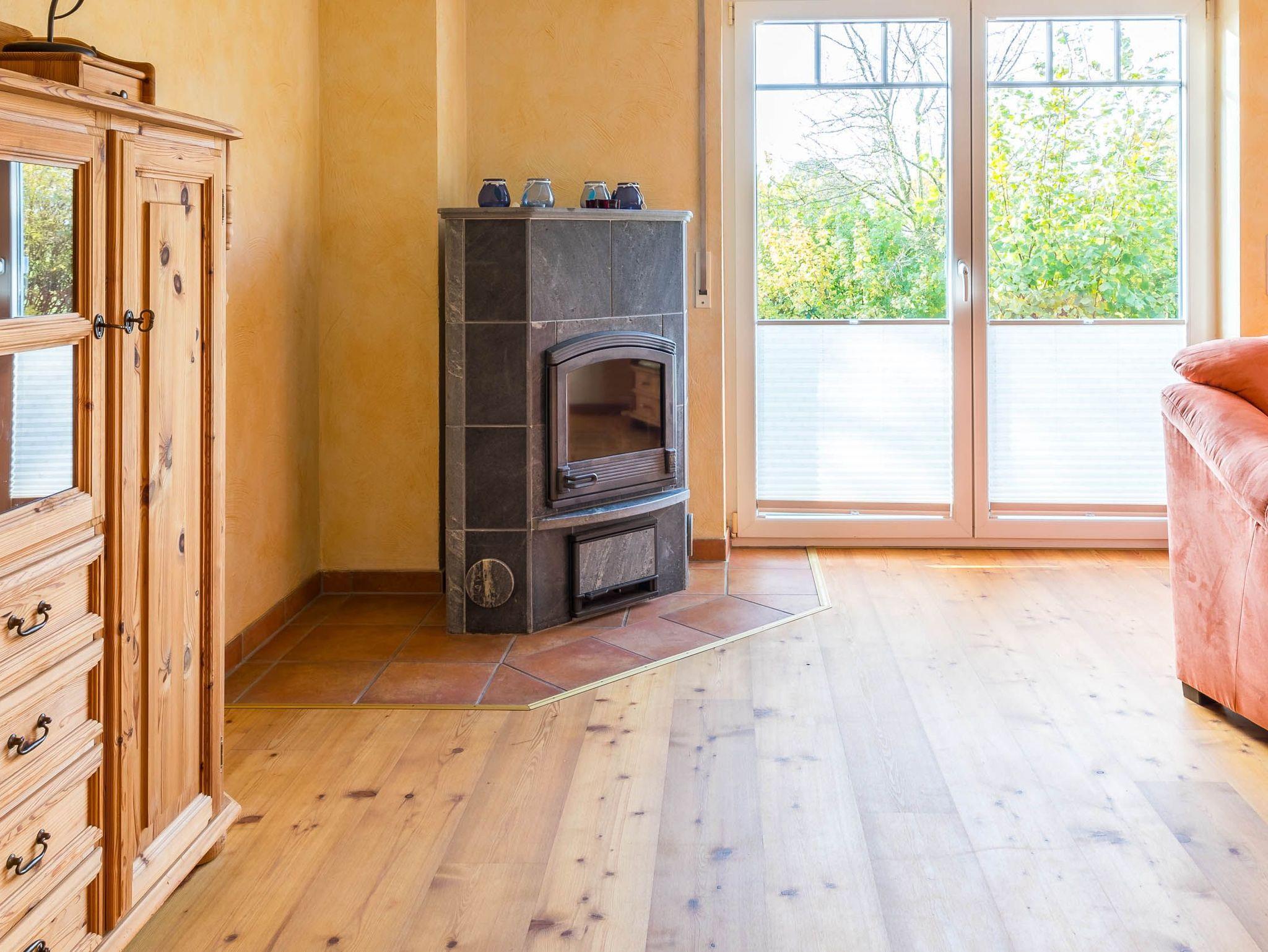 Der Wohnbereich im Erdgeschoss wartet unter anderem mit einem wunderschönen Kaminofen, zwei Sofas und einem Sessel auf perfekt für den abendlichen Ausklang nach einem ereignisreichen Tag an der Ostsee.