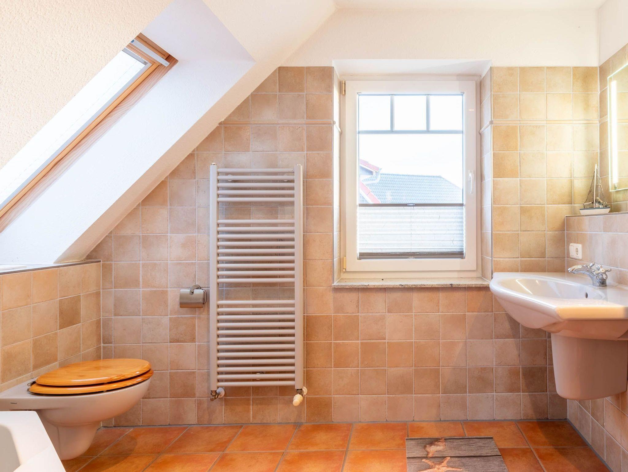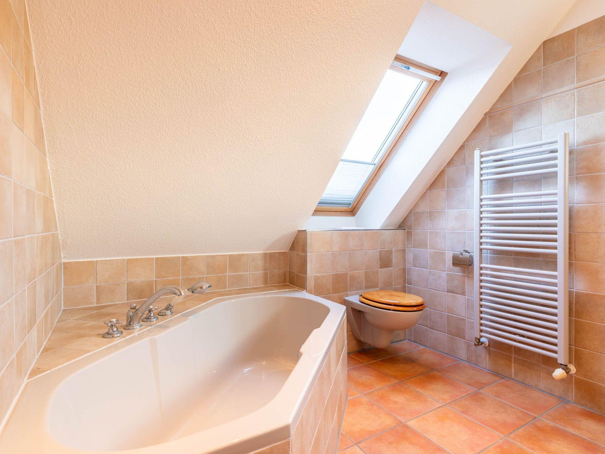Ebenso gibt es auf dieser Ebene ein Badezimmer, welches mit einer Badewanne, einer Dusche und einem WC ausgerüstet ist.