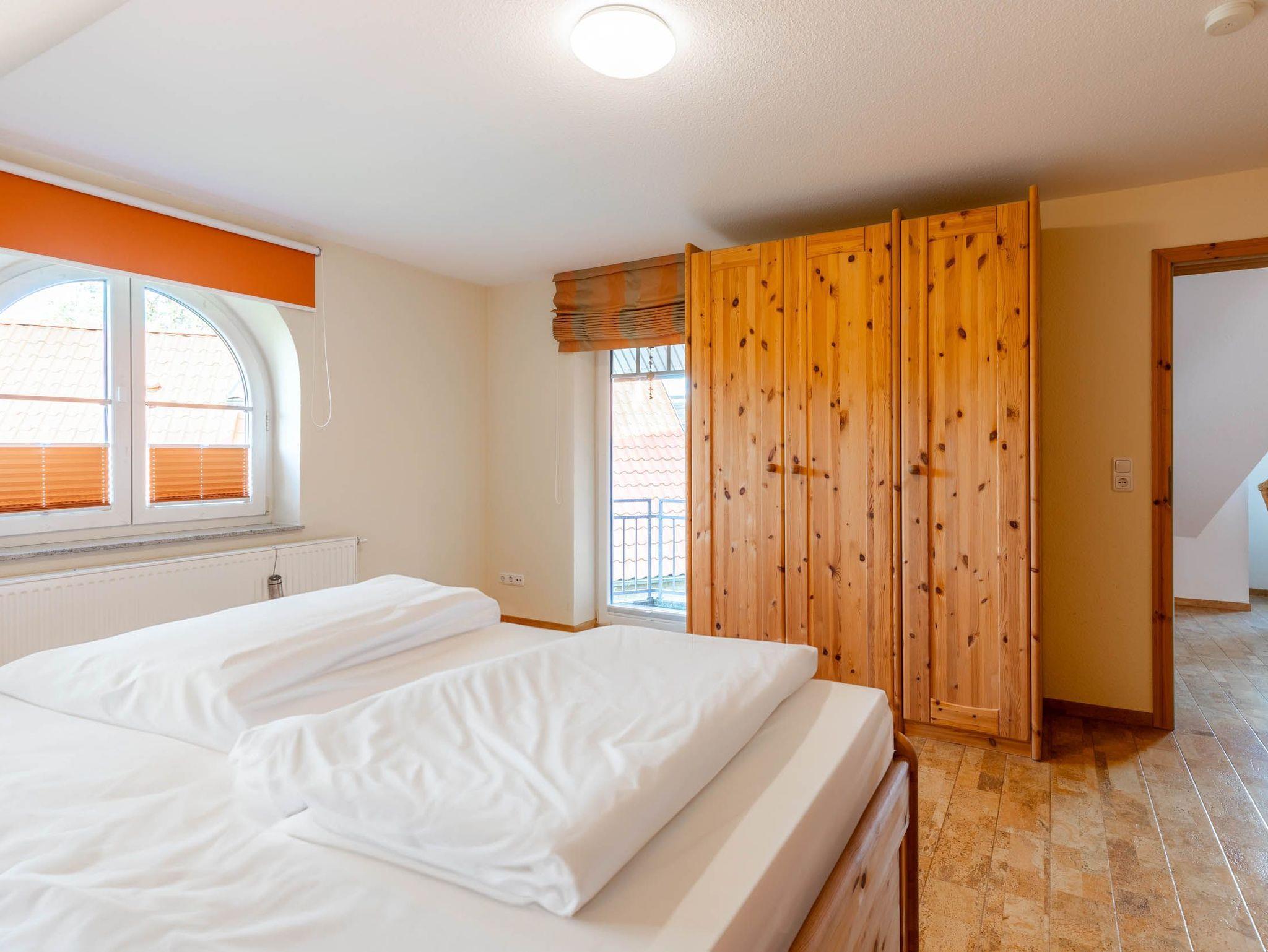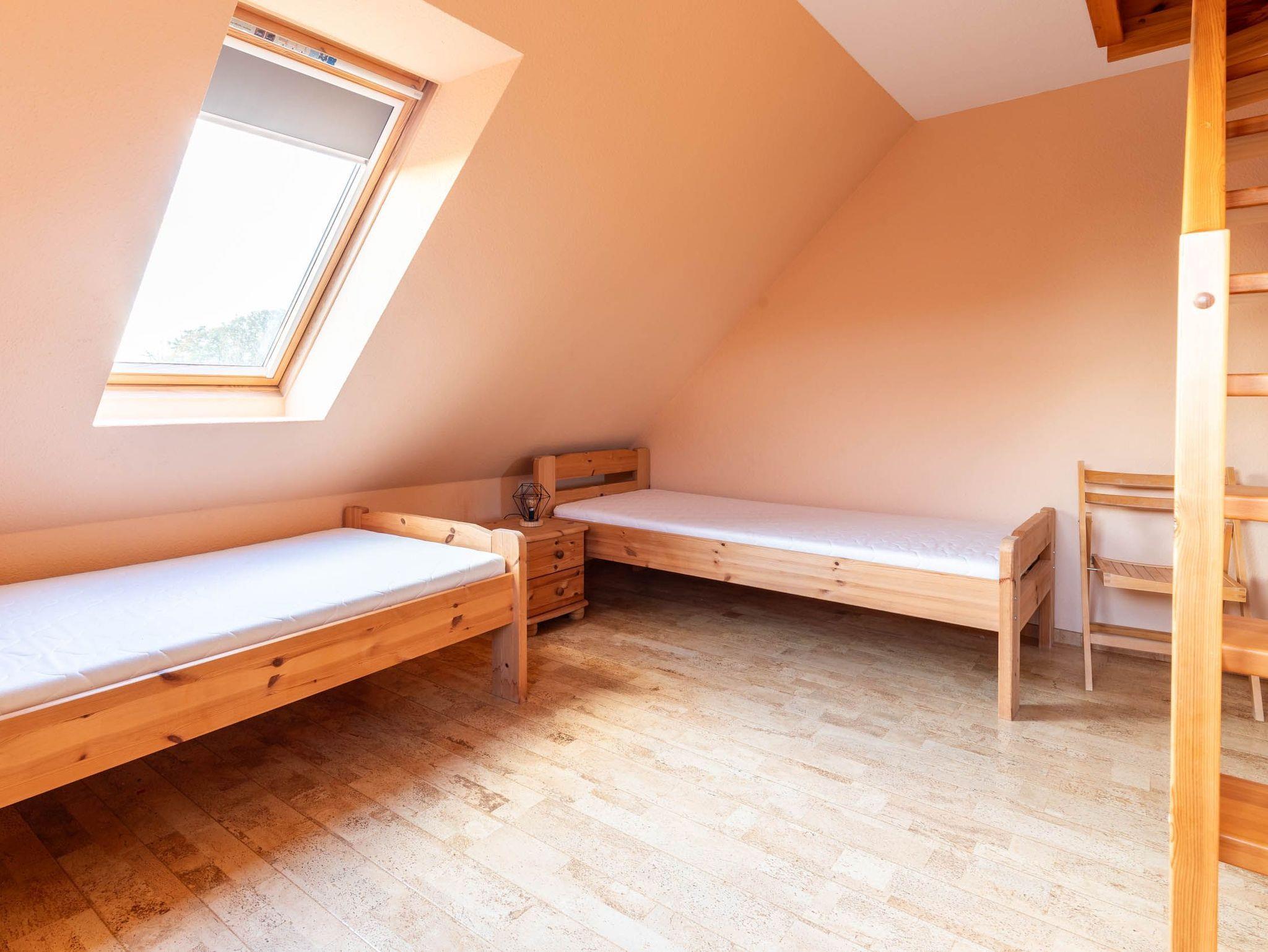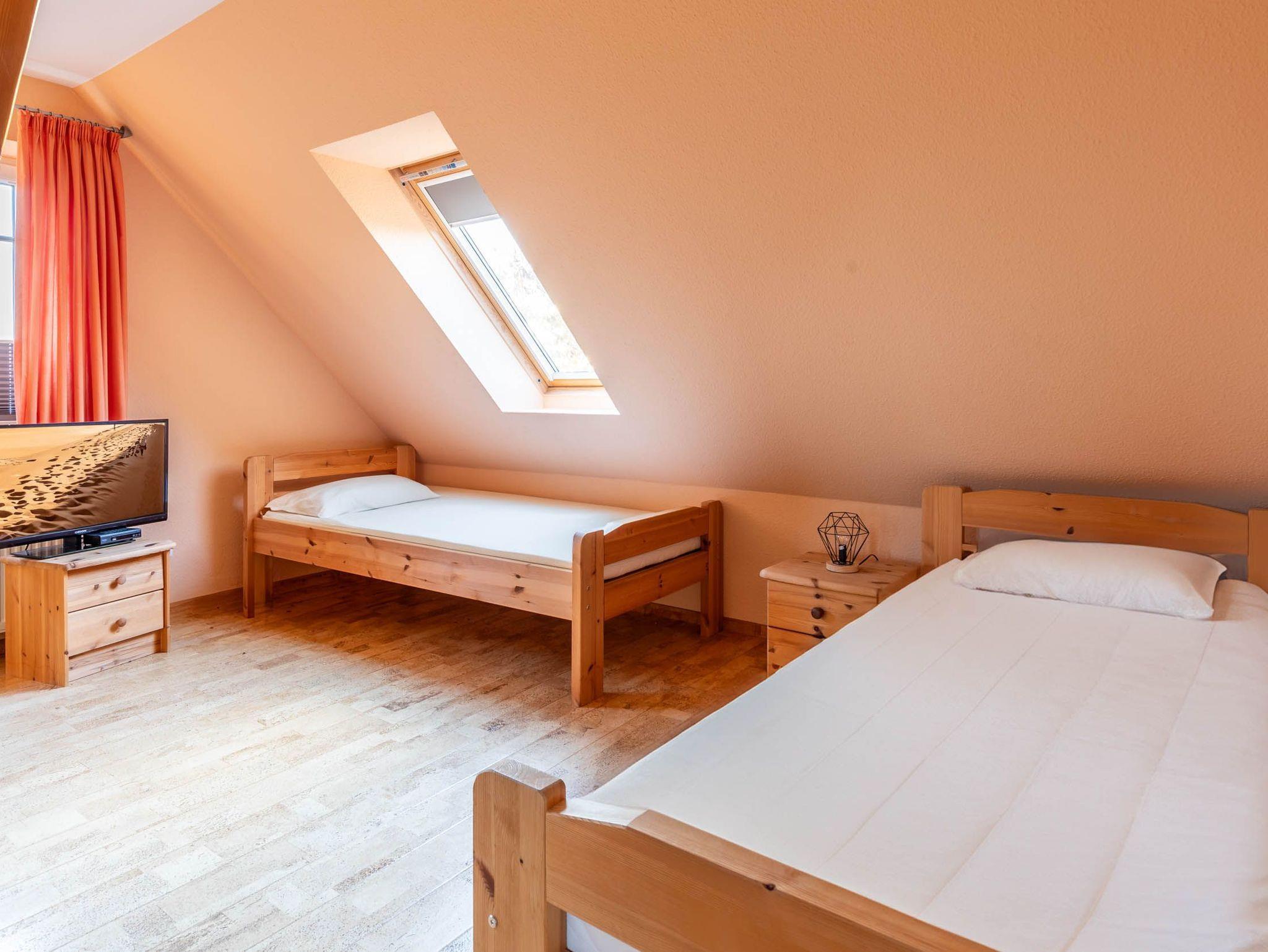 Weiterhin finden Sie auf der oberen Etage zwei separate Schlafräume. Das große Schlafzimmer ist mit einem Doppelbett, einem festen Holzgitterbett, einer Kommode sowie einem Kleiderschrank ausgestattet. Im Gäste-/ Kinderzimmer befinden sich zwei Einzelbetten, ein Kleiderschrank, ein eigenes TV-Gerät und ein DVD-Player.