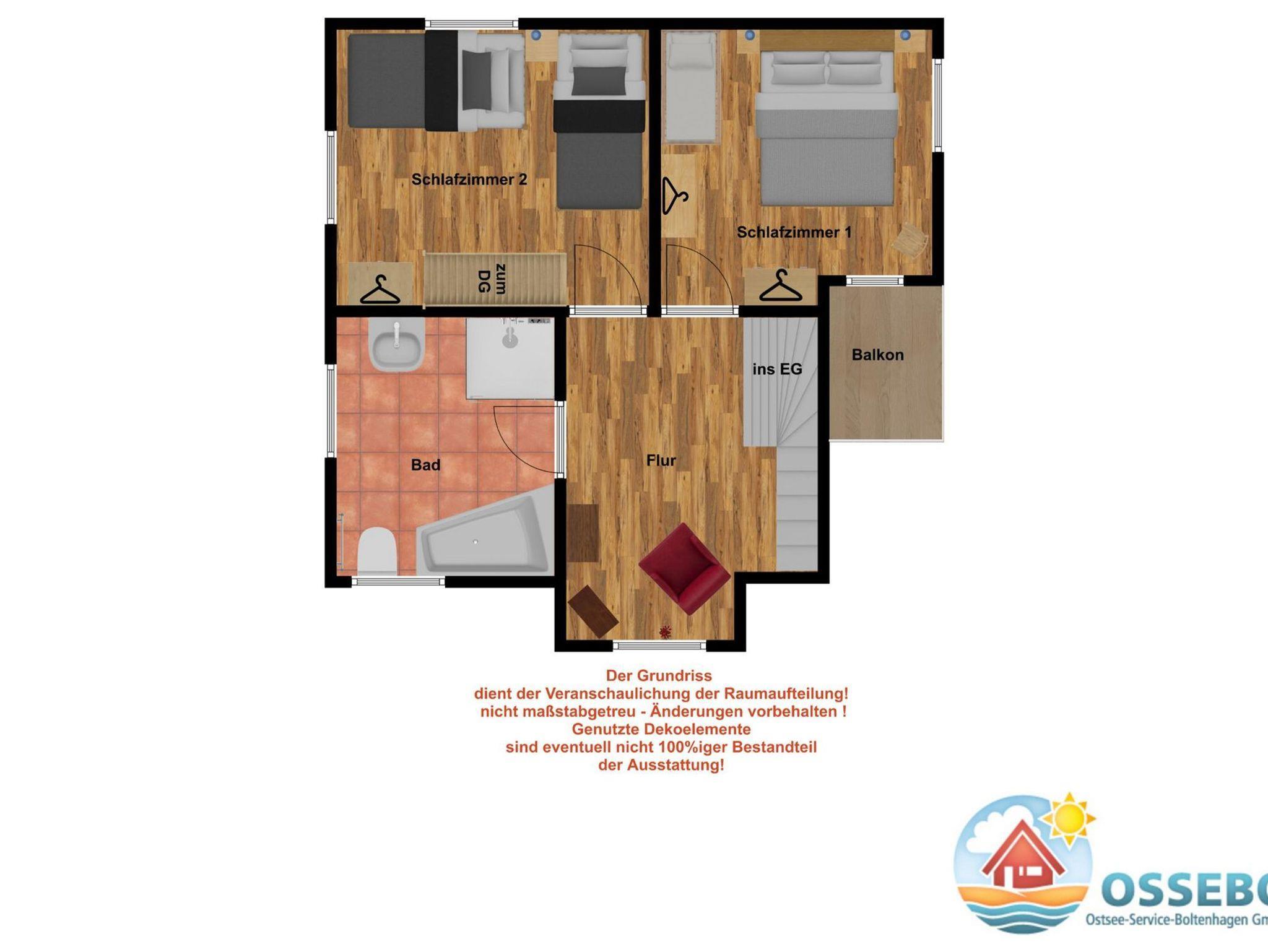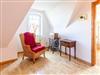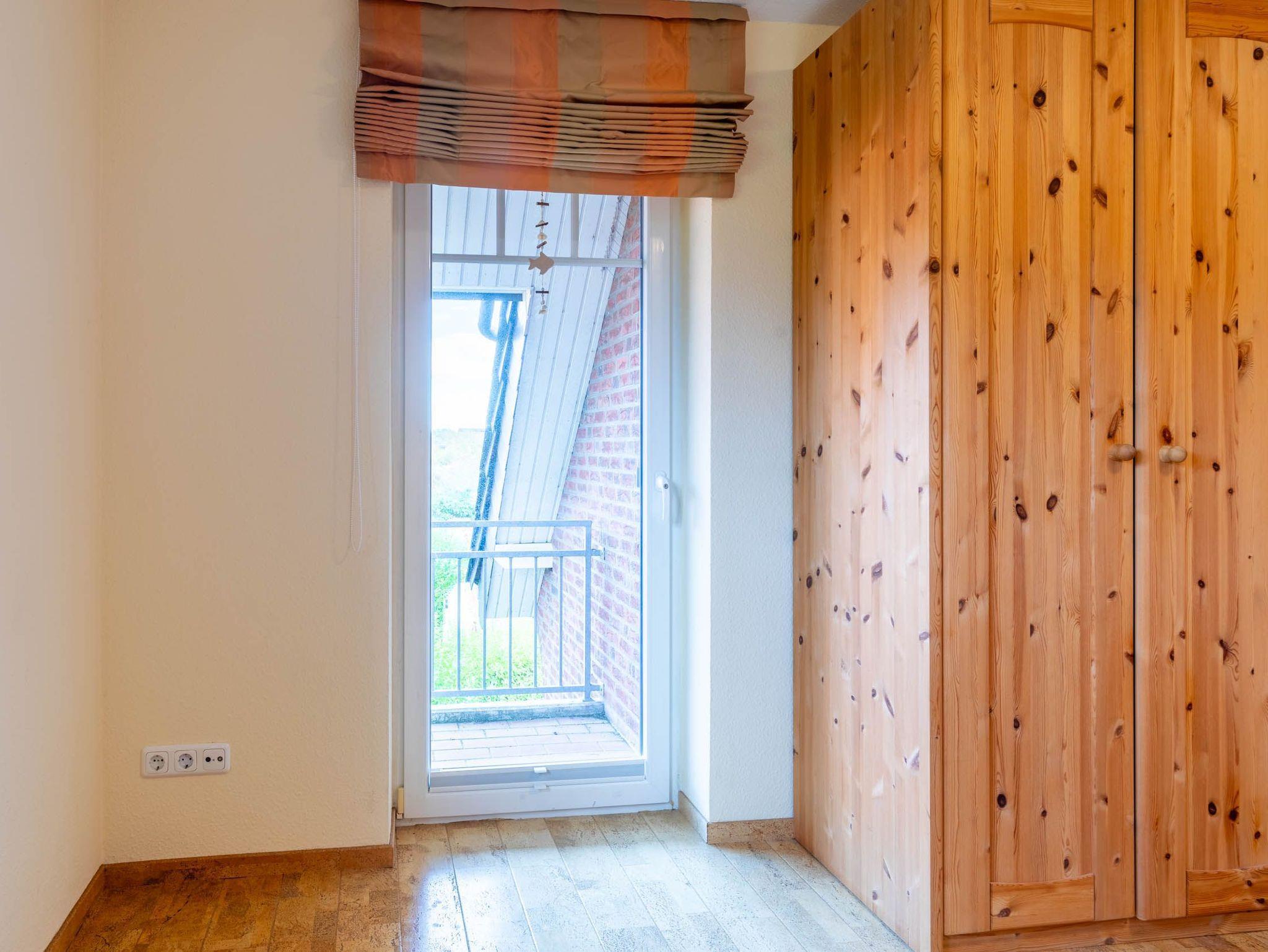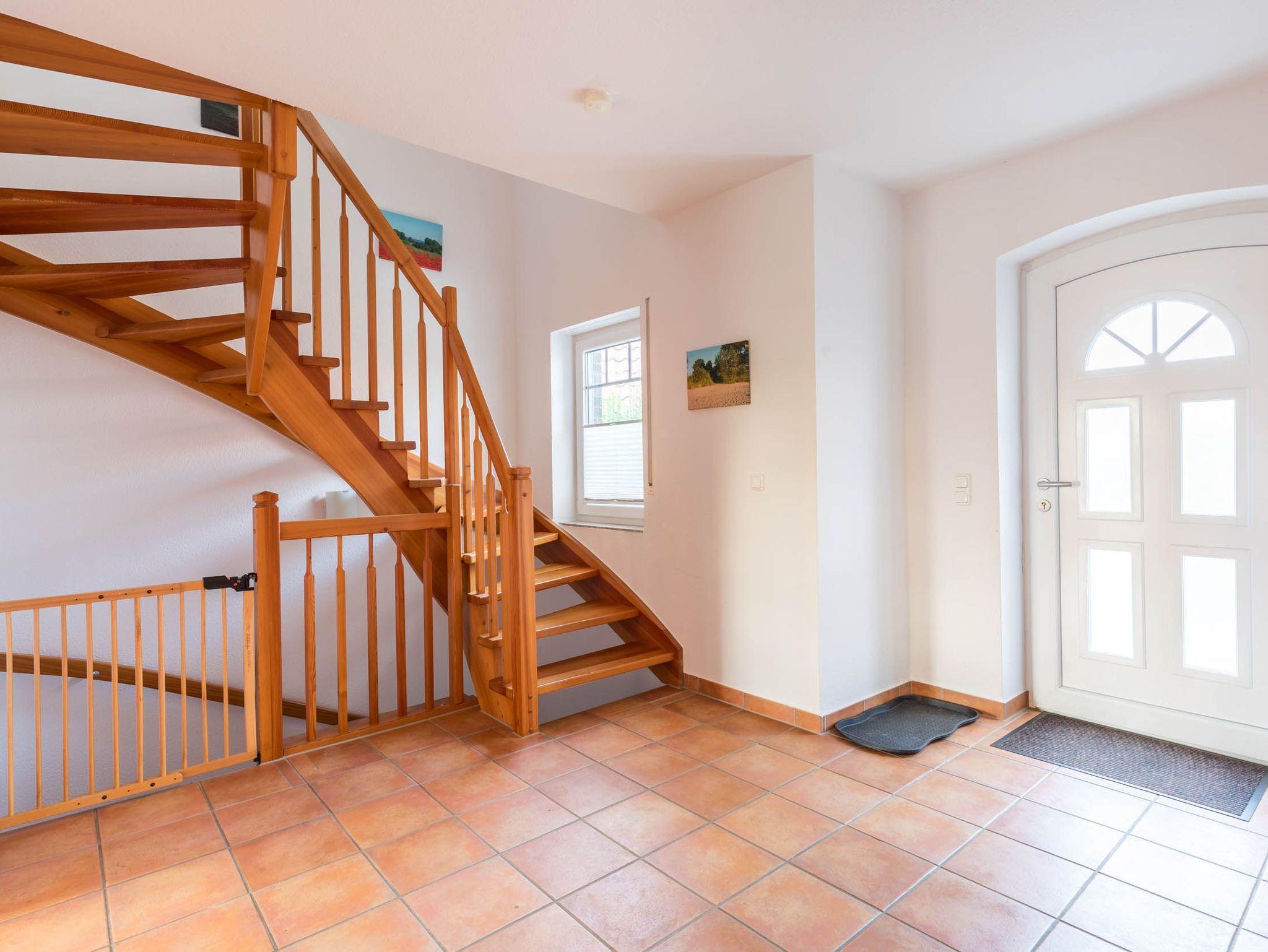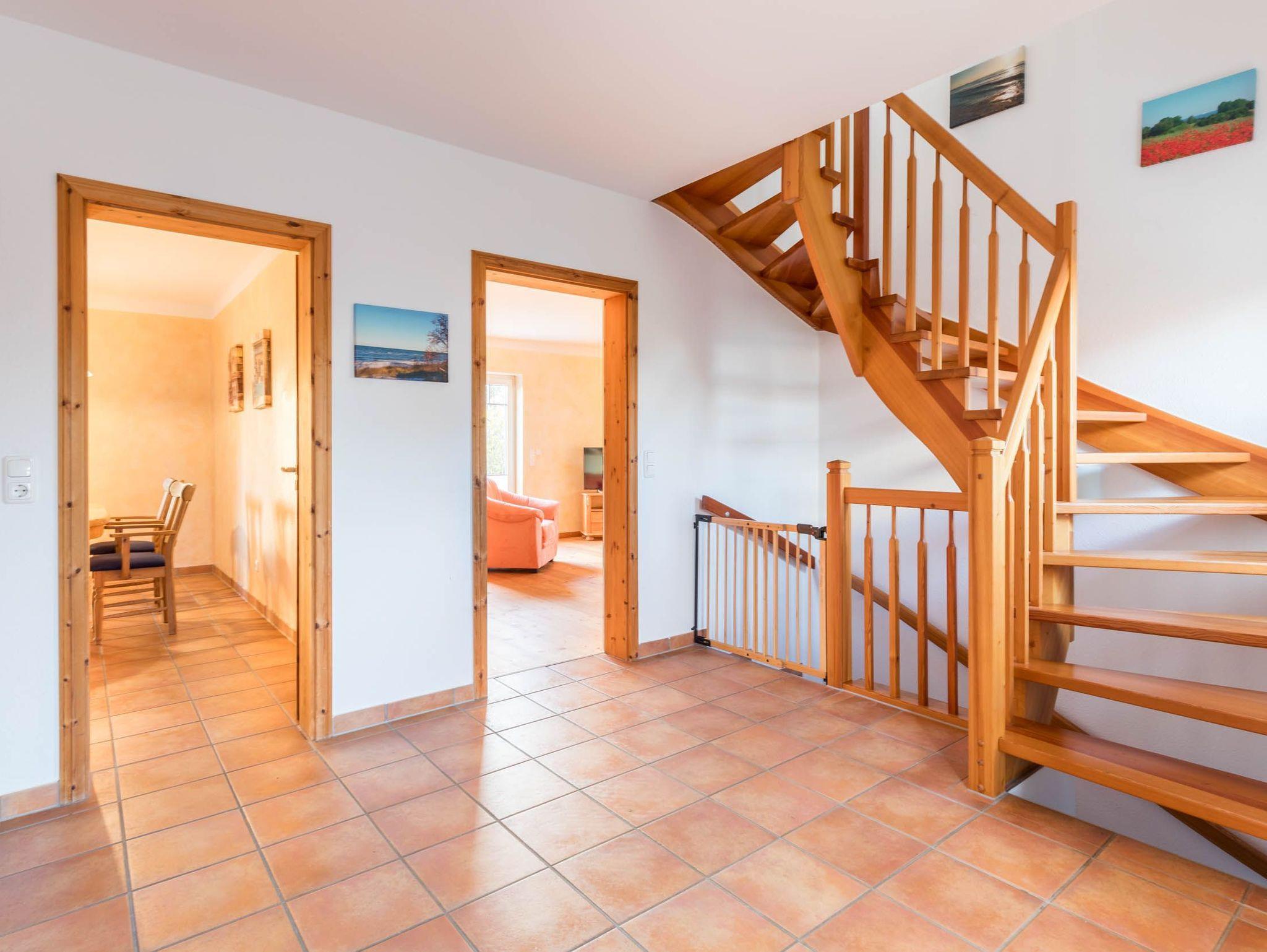 Von hier aus führt eine Holztreppe ins 1. Obergeschoss, wo sich im Friesengiebel ein schöner Sessel und eine kleine Kommode befinden - ein kleiner Rückzugsort, wenn man etwas Entspannung und Ruhe sucht. Am oberen Ende der Treppe ist ein Treppenschutzgitter befestigt.