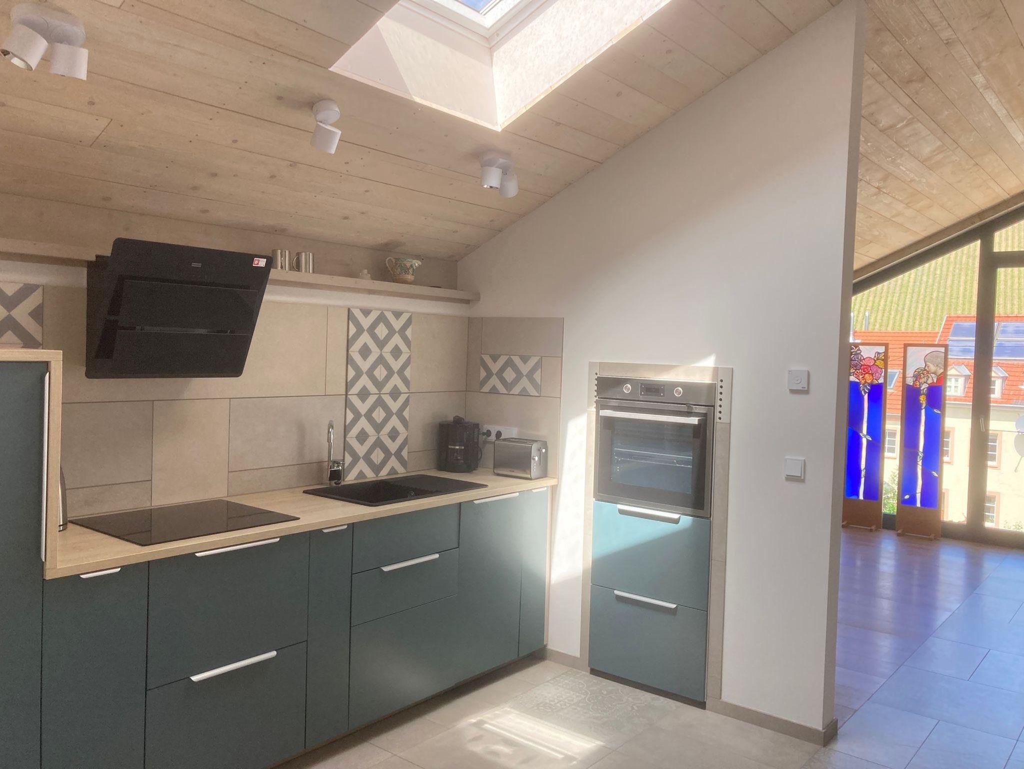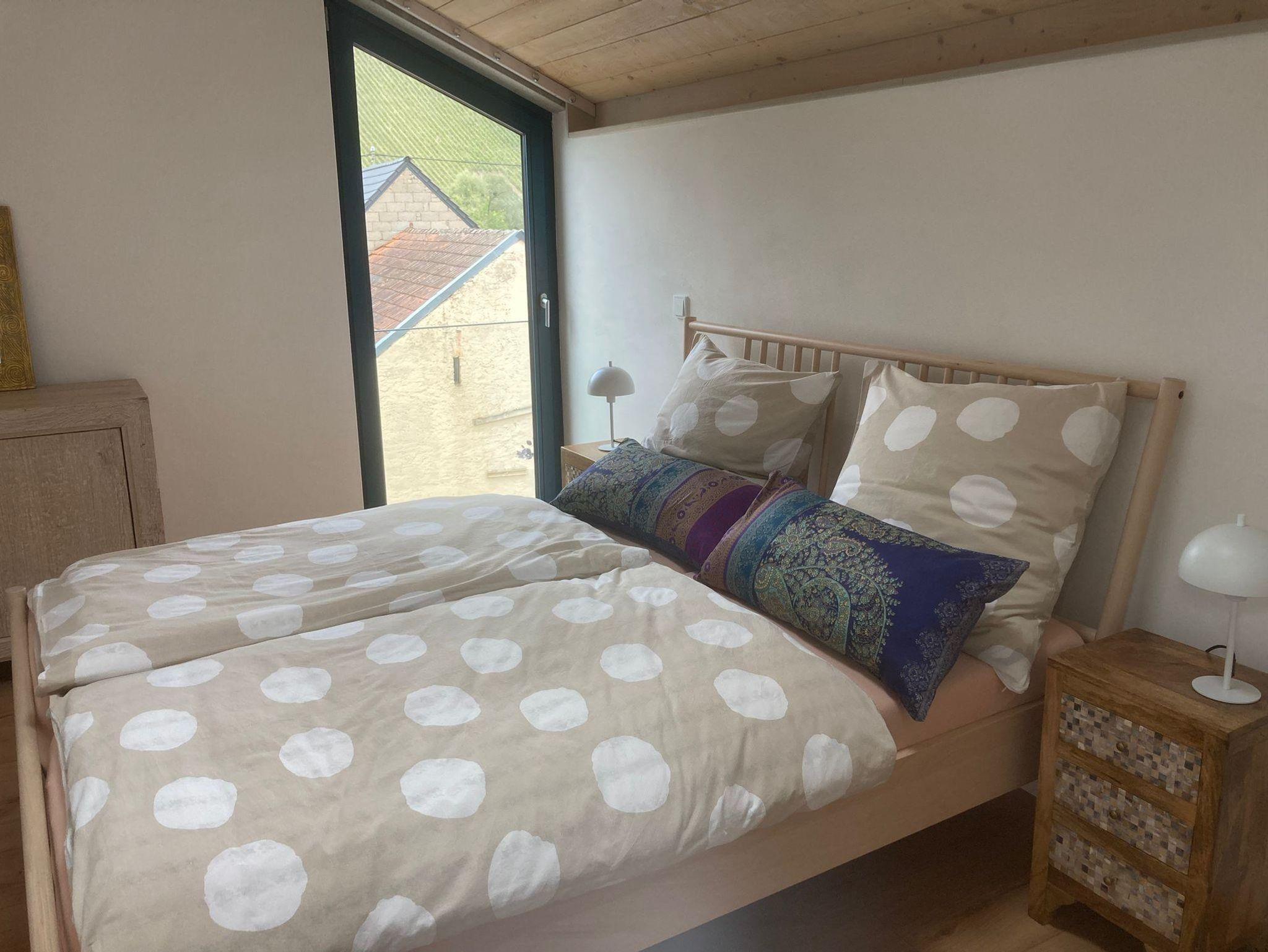 Die Ferienwohnung 4 im 2. Obergeschoss verfügt über ein sep. Doppelschlafzimmer, einem offenen Küchen-Wohnbereich mit Schlafsofa (Liegefläche 1,60 m) und Bad mit Dusche/WC. Durch die großen Panoramafenster können Sie die traumhafte Aussicht auf die Saar, den mediterranen Garten mit mehreren Sitzgelegenheiten und die Weinberge rund um die weltbekannte Weinlage Kanzemer Altenberg genießen.
