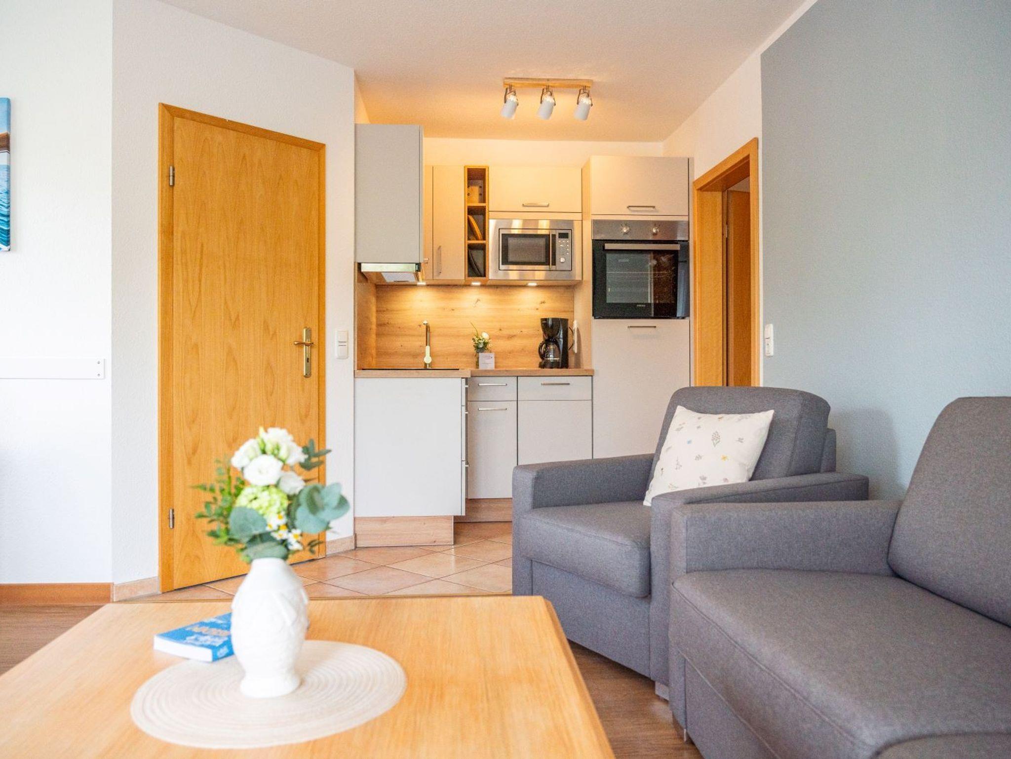 Die Ferienwohnungen am Maiglöckchenberg, Typ 1/2 sind gemütlich eingerichtet, 46m² groß und für bis zu 4 Personen ausgelegt (2 Pers. + 2 Aufbettungen). Sie besitzen ein Schlafzimmer, ein Wohnbereich mit einer offenen Küche und ein Badezimmer.