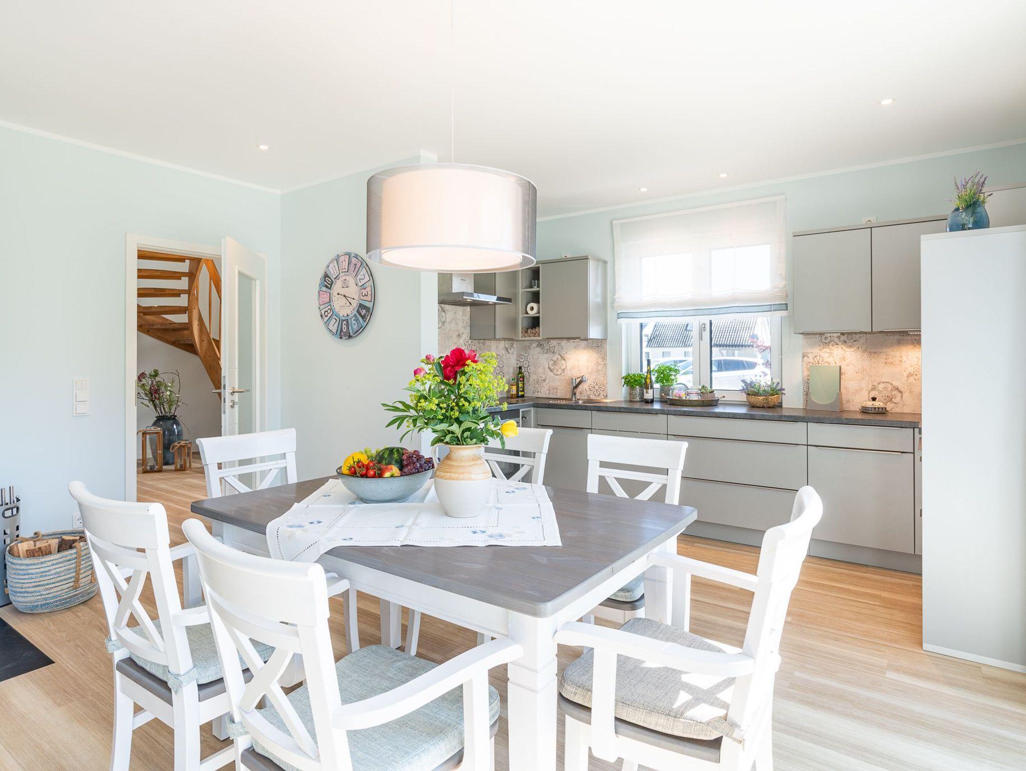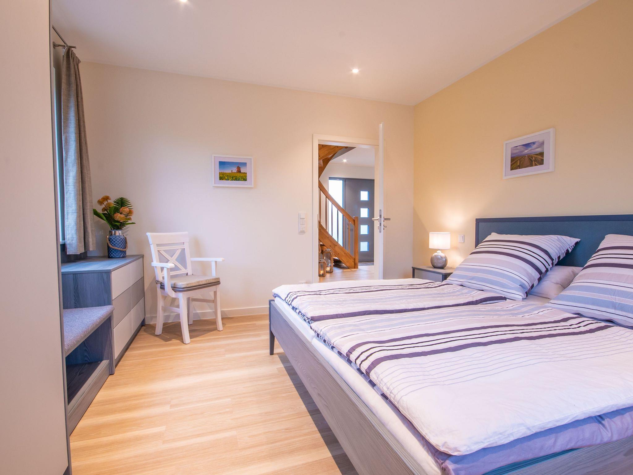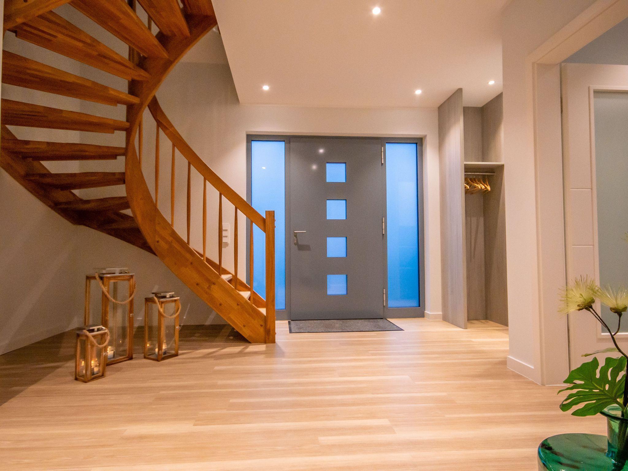 Zur Ausstattung des Hauses: Wohn- und Esszimmer im Erdgeschoss mit integrierter, vollausgestatteter Küche und anheimelndem Kaminofen, zwei Zweisitzer plus Relaxsessel in gemütlicher Atmosphäre mit Fernseher. Küche mit Kühlschrank mit VitaFresh-Fächern und Gefrierfach, Induktionskochfeld, Backofen mit Grill- und Mikrowellenfunktion, Geschirrspüler, Kaffeemaschine, Wasserkocher, Toaster, Geschirr, Besteck, Kochgeschirr etc. Bad im Erdgeschoss mit Badewanne und Dusche. Bad im Obergeschoss mit Dusche, Fön und angrenzender Sauna, großzügig geschnitten für Ihren Saunagang. Zwei Schlafzimmer jeweils mit Doppelbett, Kofferbank und ausreichend Stauraum für Ihre Lieblingsstücke. Wohn- und Schlafzimmer im Obergeschoss mit zwei Einzelbetten, Fernseher, Schreibtisch und Schränken etc. Hauswirtschaftsraum mit Waschmaschine und Wäscheständer, Bügeleisen und Staubsauger zzgl. drei verschließbarer Wertfächer für Ihre persönlichen Wertgegenstände. (Kinderhochstuhl/Babybett auf Wunsch kostenfrei verfügbar) Das gesamte Haus ist mit Fussbodenheizung ausgestattet.