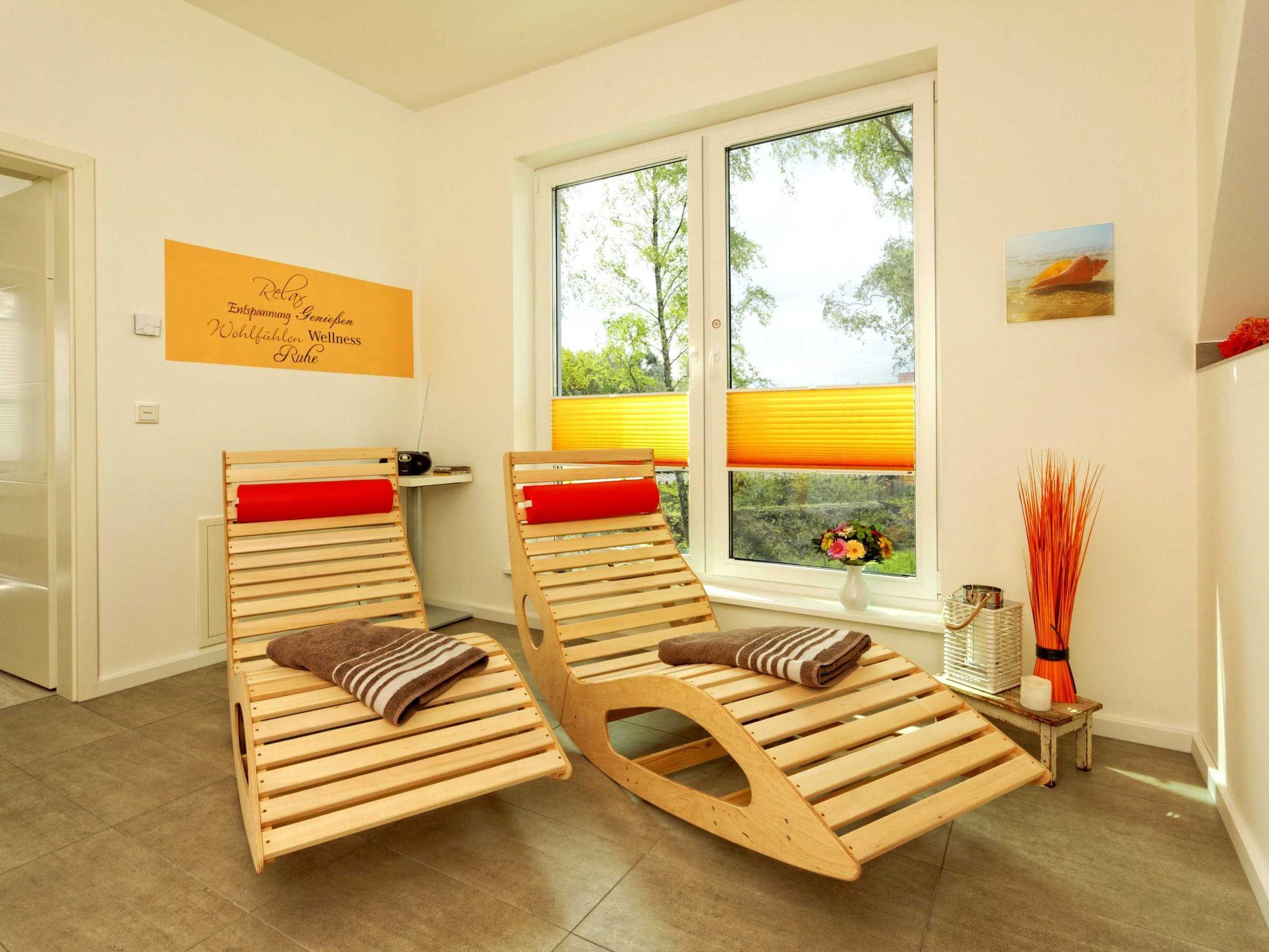• Wellnessbereich mit Sauna, bodentiefer Dusche, Whirlwanne für 2 Personen mit Farblicht-Therapie, Ruheraum mit 2 Holz-Wipp-Relaxliegen, Bade- und extra langes Liegentuch, 1 Swingstepper mit 2 Zugbändern, Dachterrasse