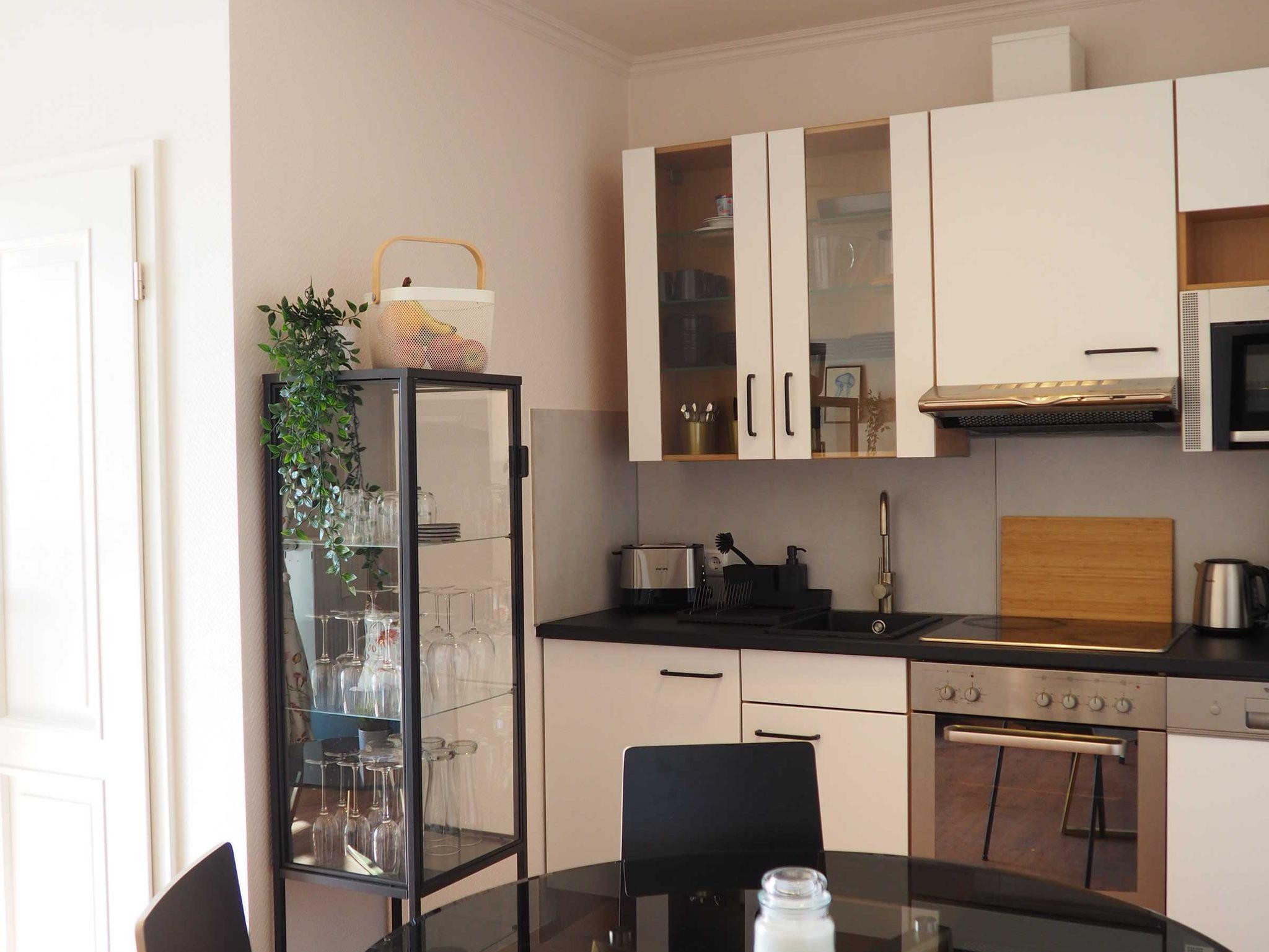 Die modern und exklusiv ausgestattete Ferienwohnung (2 Zimmer / 37 qm) befindet sich in ruhiger Lage des im Juli 2003 fertig gestellten ersten Abschnitts der Ferienwohnanlage Hafenidyll direkt am Yachthafen von Karlshagen. Ein Wohnzimmer mit Esstisch, Schlafcouch und Couchtisch sowie ein separates Schlafzimmer (mit einem 1,80 m großen Boxspringbett) bieten bieten ideal Platz für 2 Personen. Bis zu 2 weitere Personen können auf der im Wohnzimmer stehenden Schlafcouch übernachten. Ein klappbares Kinderbett und Hochstuhl können ohne Aufpreis genutzt werden. Im Wohnzimmer befindet sich eine komplett ausgestattete Küchenzeile inklusive Geschirrspüler, Mikrowelle, Kühlschrank mit Tiefkühlfach, Elektroherd mit 1 Ceran-Kochfeld (4 Kochstellen) und Backofen, Kaffeemaschine, Toaster und Wasserkocher. Kabel-TV und eine Stereoanlage mit Radio+CD/DVD-Player stehen im Wohnzimmer zur Verfügung.