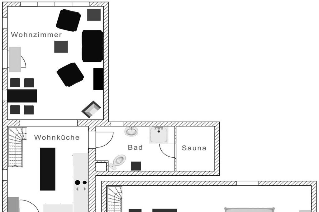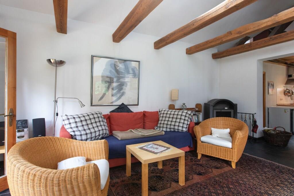 Der Stall ist ein kleines massiv gebautes Ferienhaus aus dem 19. Jhdt. - innen großzügig ausgebaut mit alten Holzbalken, mit offenem Schlafraum im Dach und Blick in den Himmel. Schieferfußboden, großer Wohn-Ess-Küchenraum mit Zugang zur Veranda. Und ein Bad mit eigener Sauna.
