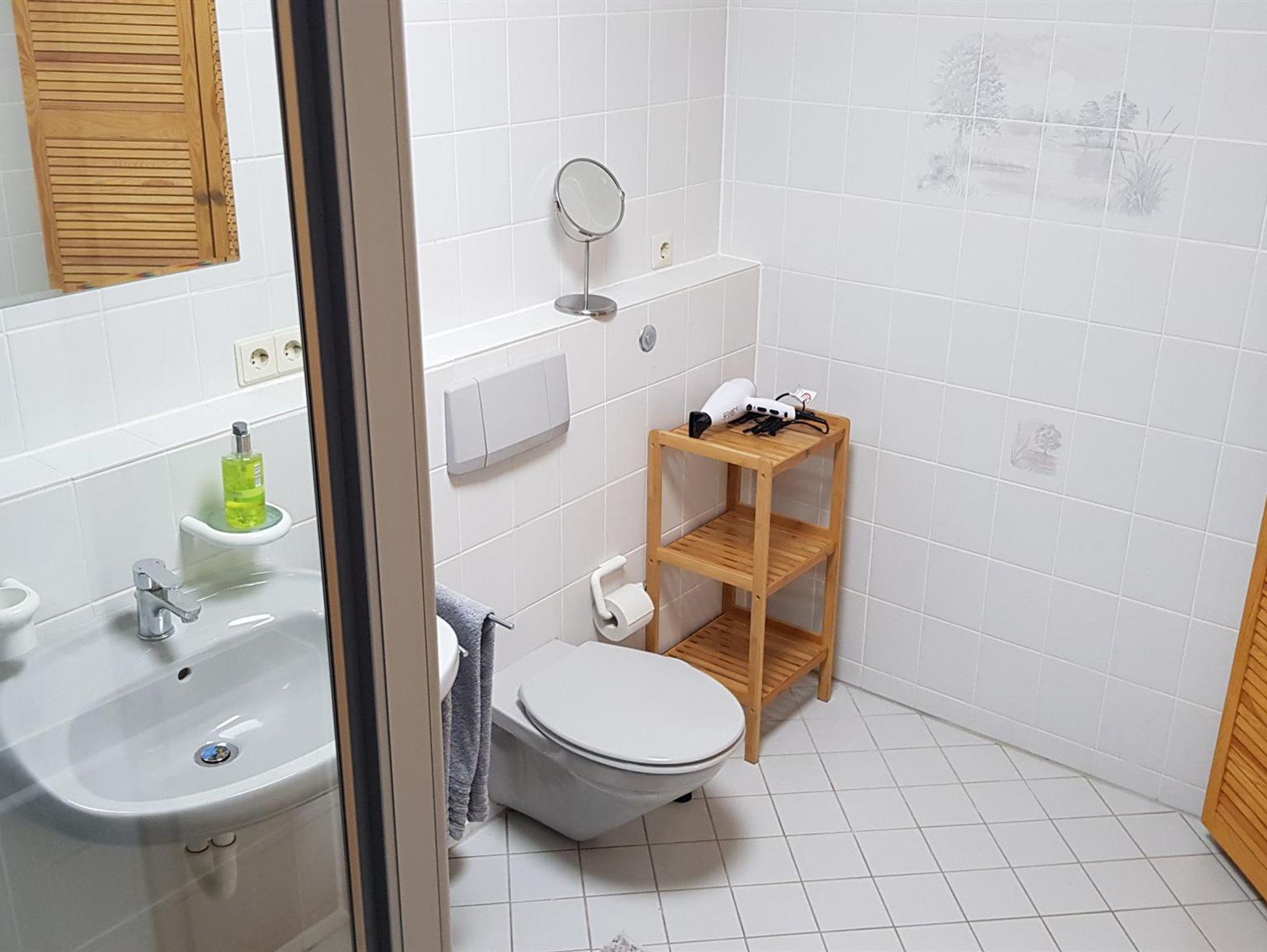 Sie schlafen in einem neuen Boxspringbett. Das Badezimmer hat eine große Dusche.
