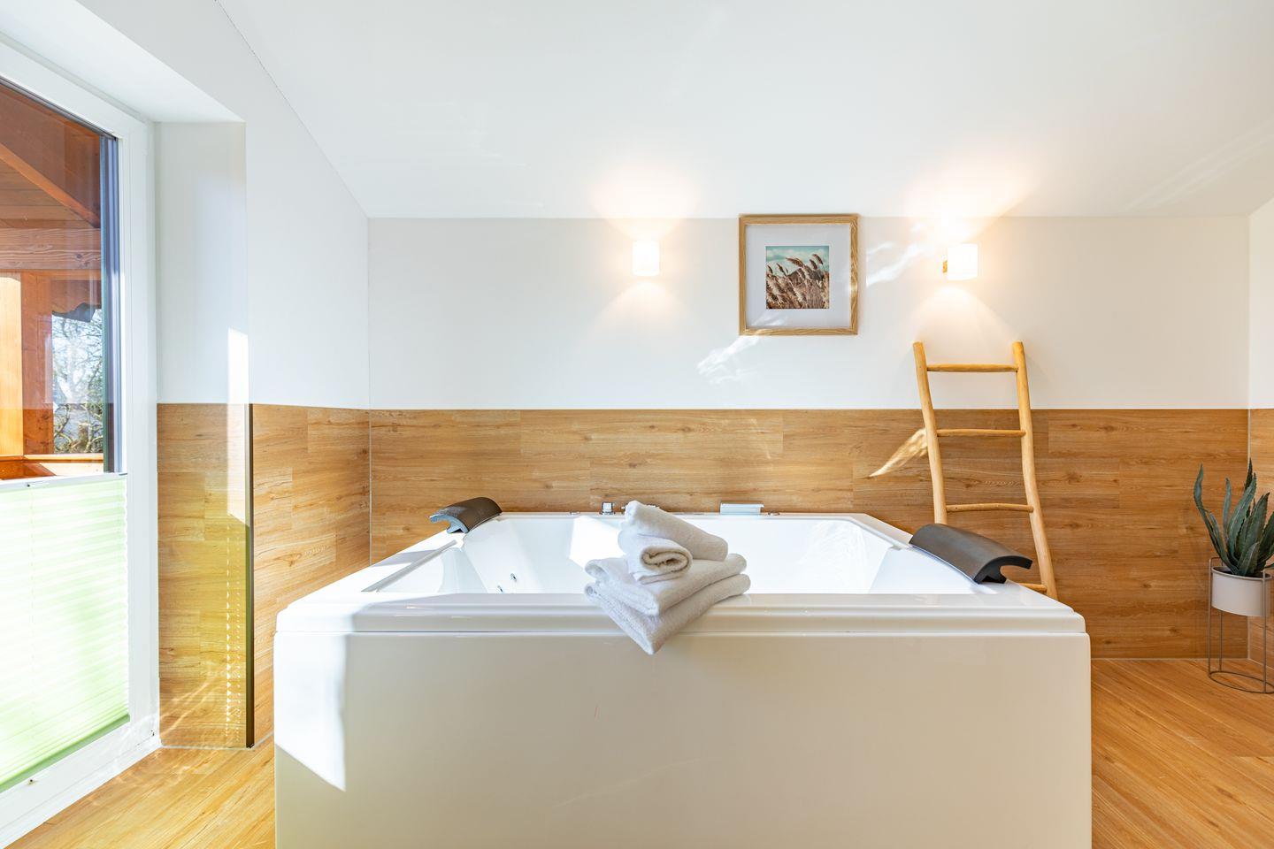 Ein modernes Badezimmer mit bodengleicher Dusche, WC sowie Sauna und einem Whirlpool sorgen für besonderen Komfort. Ein echtes Highlight ist der angrenzende Balkon mit wunderbarer Aussicht über das Katinger Watt!