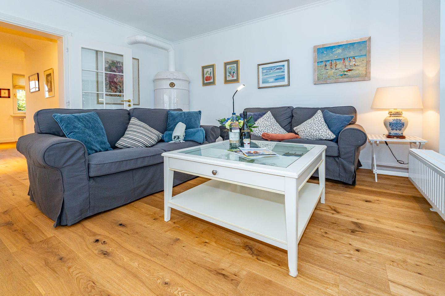 Durch die Eingangstür gelangt man in einen Flur über den die Küche, ein Gäste- WC und das Wohnzimmer mit Essbereich erreichbar sind. Die Küche verfügt über ein Ceranfeld und einen Backofen, sowie eine Geschirrspülmaschine. Das Wohnzimmer ist hell eingerichtet und ist mit einem Mylin Kachelofen ausgestattet. Vom Wohnzimmer aus gelangt man in den großzügigen und wunderschönen angelegten Garten mit Terrasse, die über einen Strandkorb (saisonal) verfügt. Über eine Treppe gelangen Sie in das 1. OG, wo sich die Schlafzimmer und das Duschbad befinden. Ein Schlafzimmer verfügt über ein Doppelbett (180x200), das andere über zwei Einzelbetten (2x 90x200).