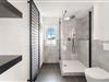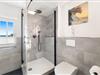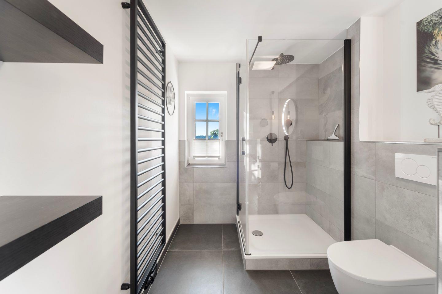 Das moderne Badezimmer mit bodengleicher Dusche und WC befindet sich auf der ersten Ebene und ist ein komfortabler Rückzugsort.