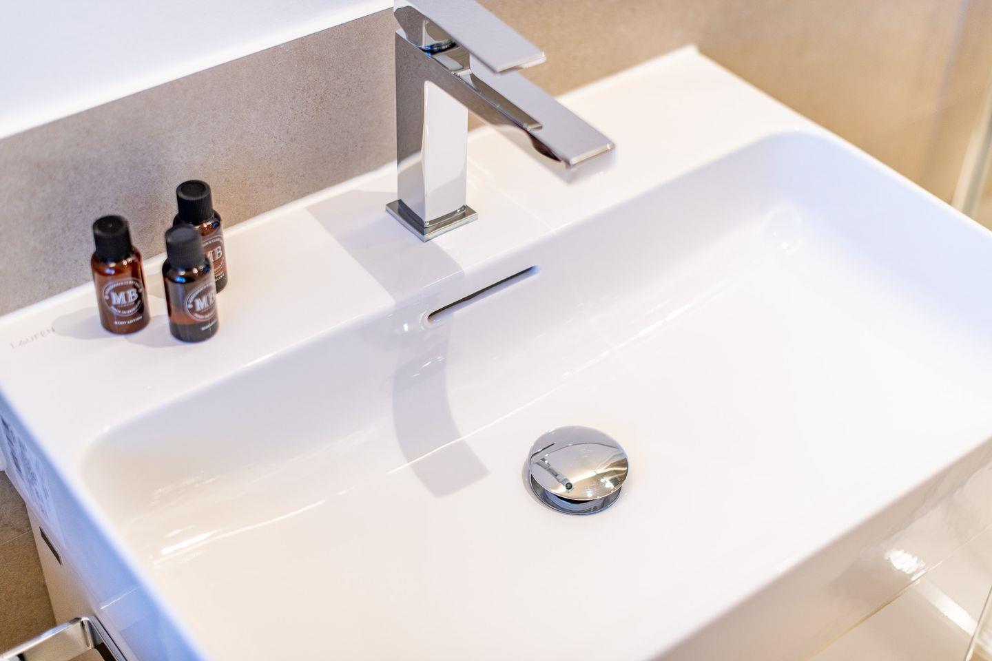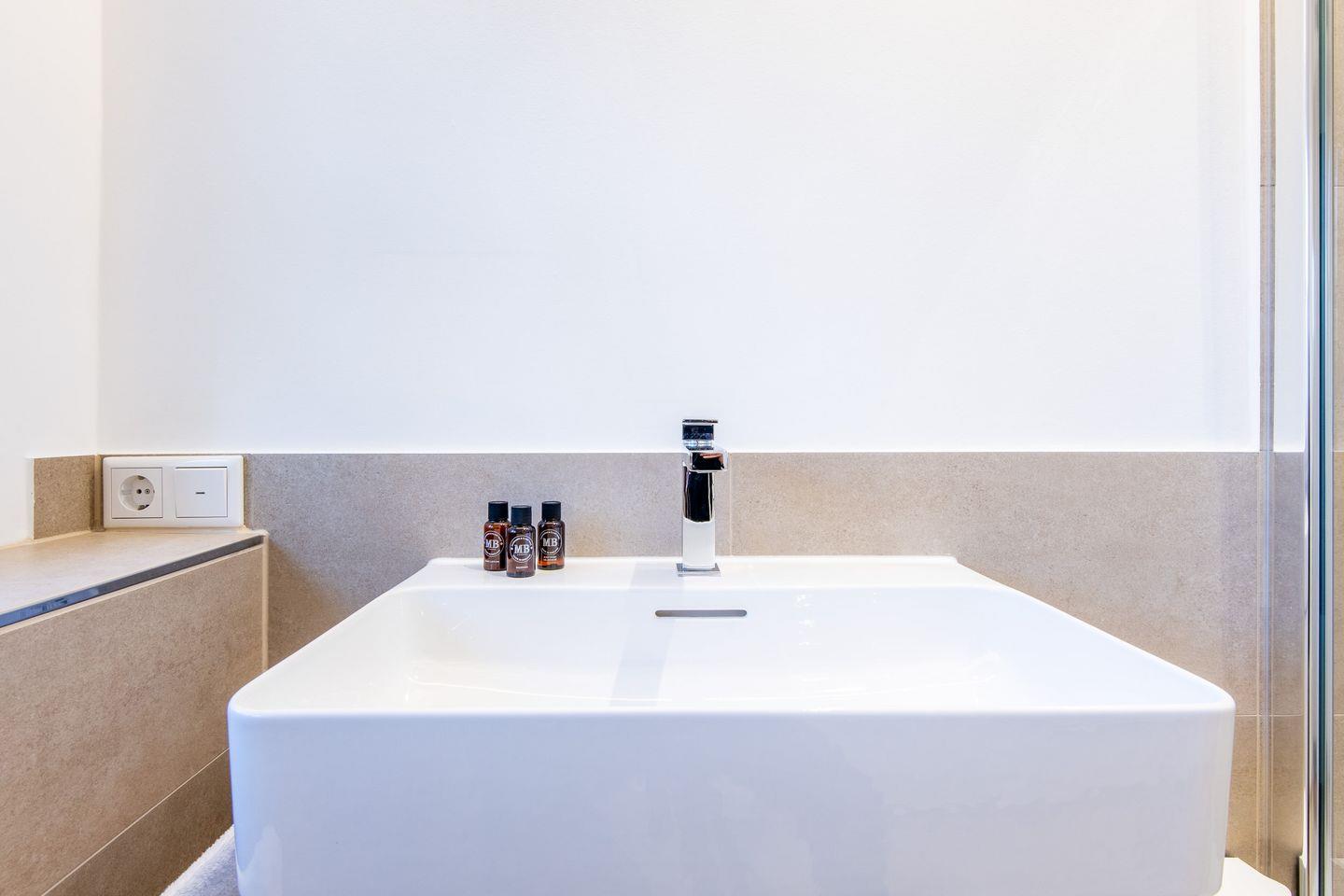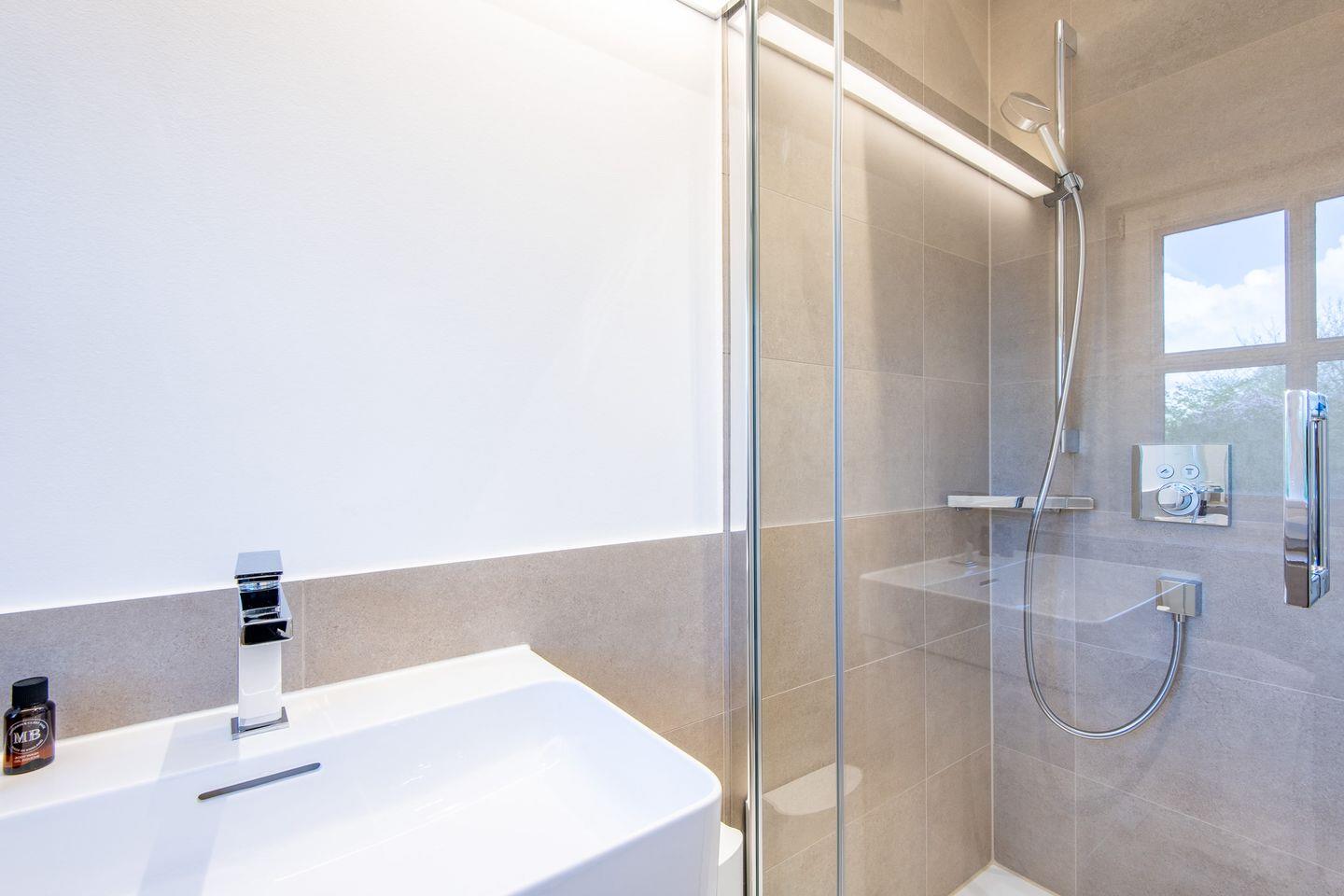 Das moderne Badezimmer verfügt über eine ebenerdige Dusche, ein WC, einen Handtuchwärmer und Tageslicht. Es bietet Ihnen den nötigen Komfort für einen entspannten Start in den Tag.