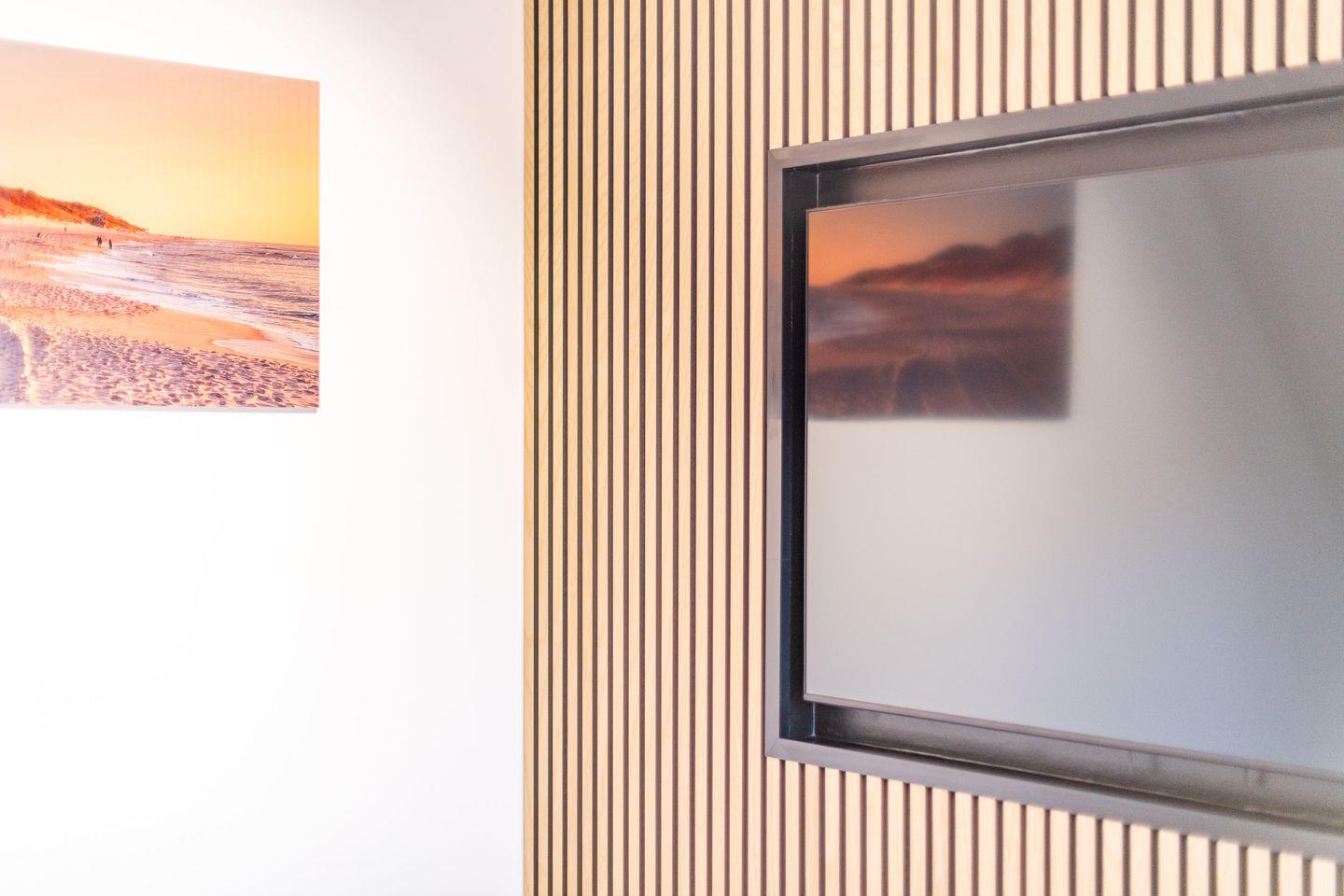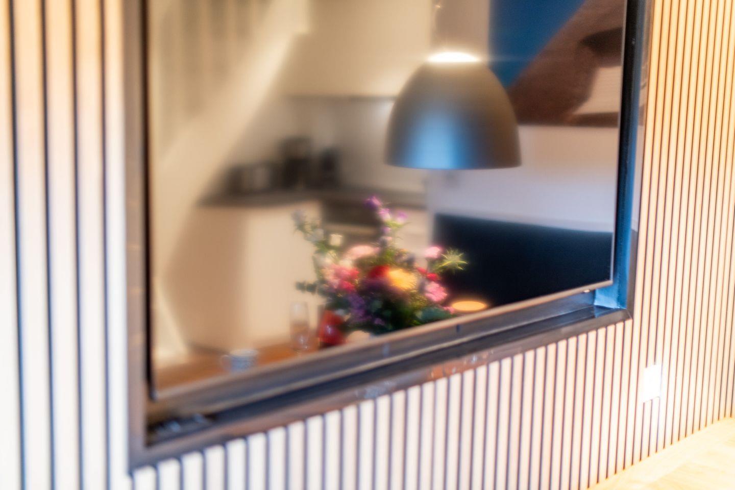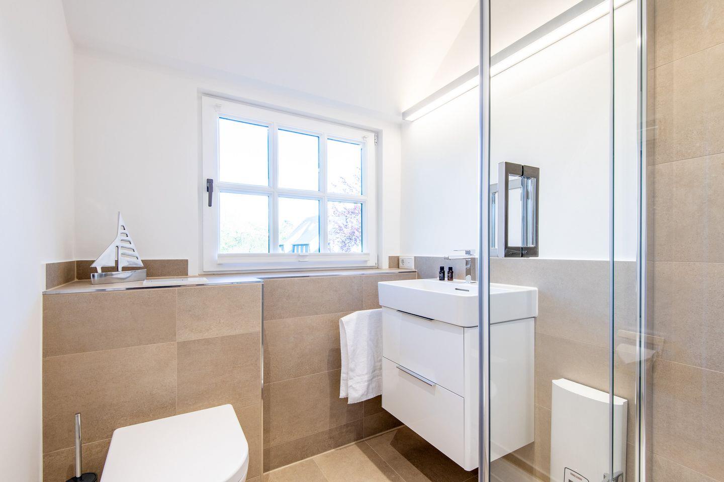 Das moderne Badezimmer verfügt über eine ebenerdige Dusche, ein WC, einen Handtuchwärmer und Tageslicht. Es bietet Ihnen den nötigen Komfort für einen entspannten Start in den Tag.