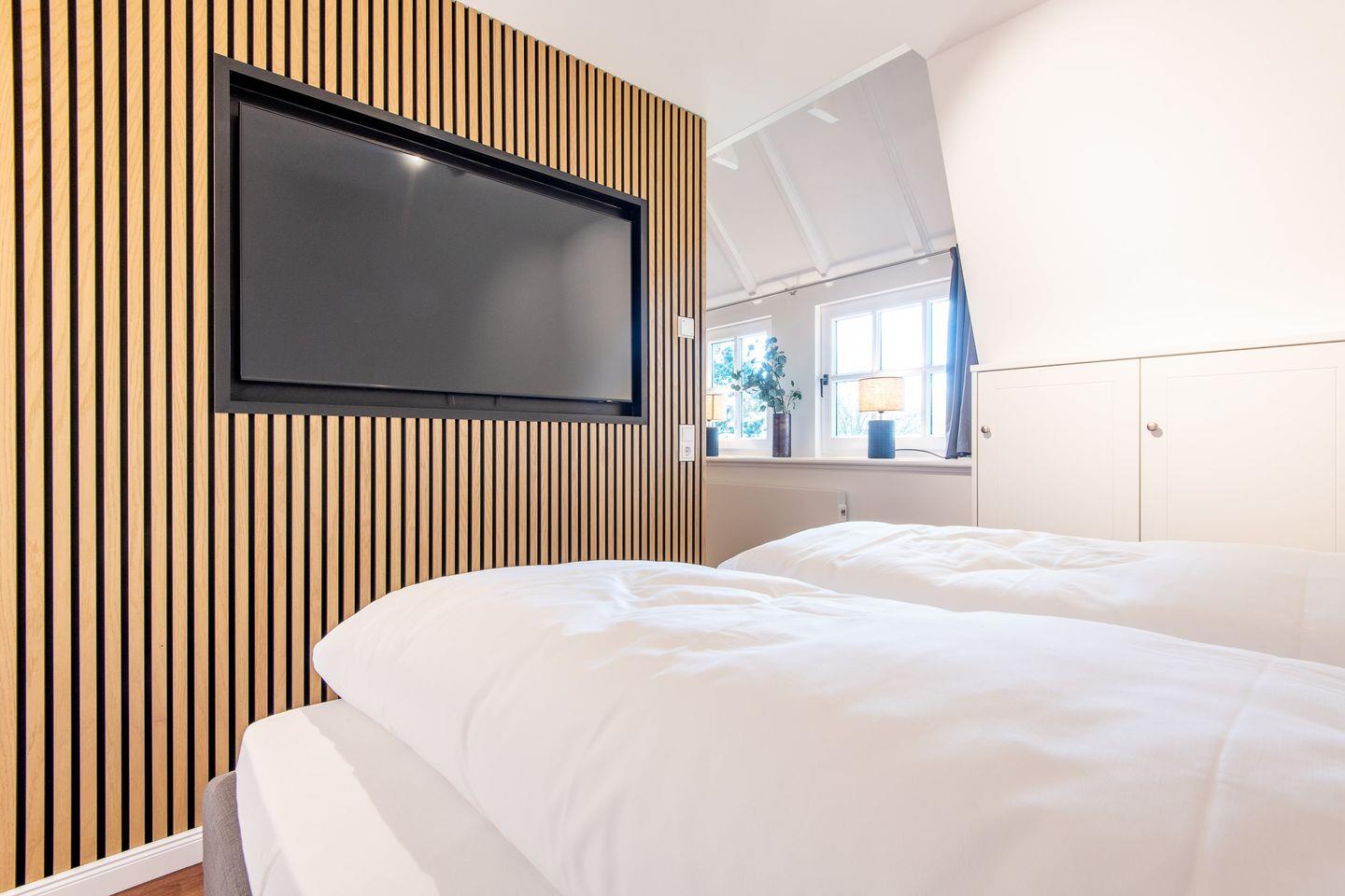 Im Schlafzimmer erwartet Sie ein komfortables Doppelbett (180x200 cm), ein Kleiderschrank und ein TV, sodass Sie sich nach einem erlebnisreichen Tag entspannen können. Ein weiterer Raum dient als Ruheraum. Hier finden Sie auch eine kleine Lounge, die zum Entspannen einlädt.