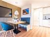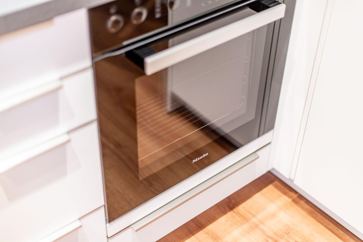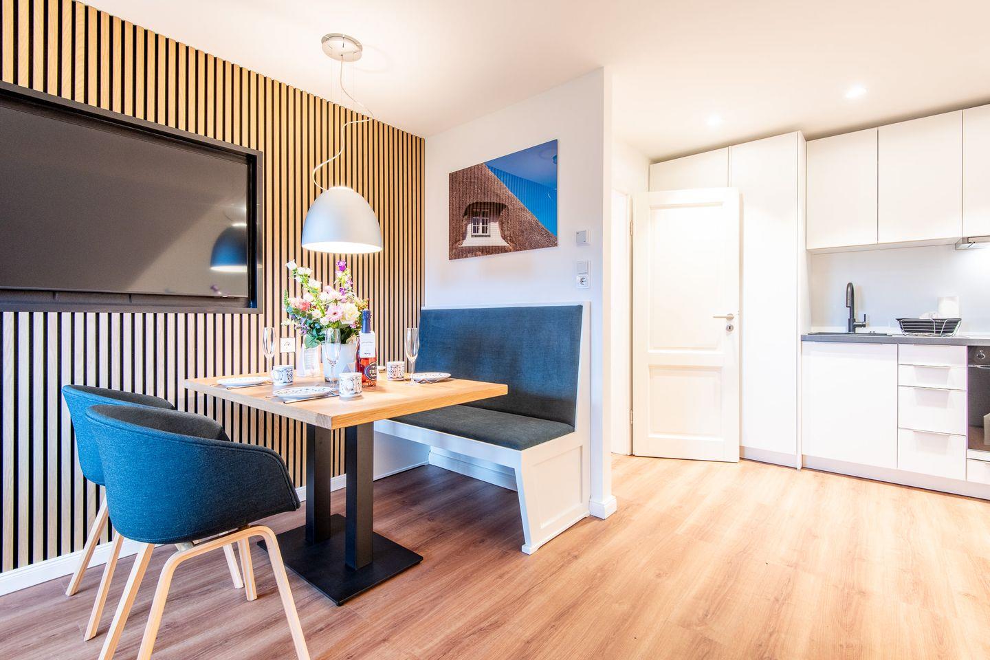 Der gemütliche Wohnbereich lädt zum Entspannen ein und bietet ein komfortables Schlafsofa sowie einen Essbereich für gemeinsame Mahlzeiten. Große Fenster lassen viel Tageslicht herein und schaffen eine helle und freundliche Atmosphäre. Die offene Küche ist voll ausgestattet und verfügt über moderne Geräte wie eine Spülmaschine, einen Backofen und eine Mikrowelle – ideal für die Zubereitung köstlicher Mahlzeiten in gemütlicher Runde.