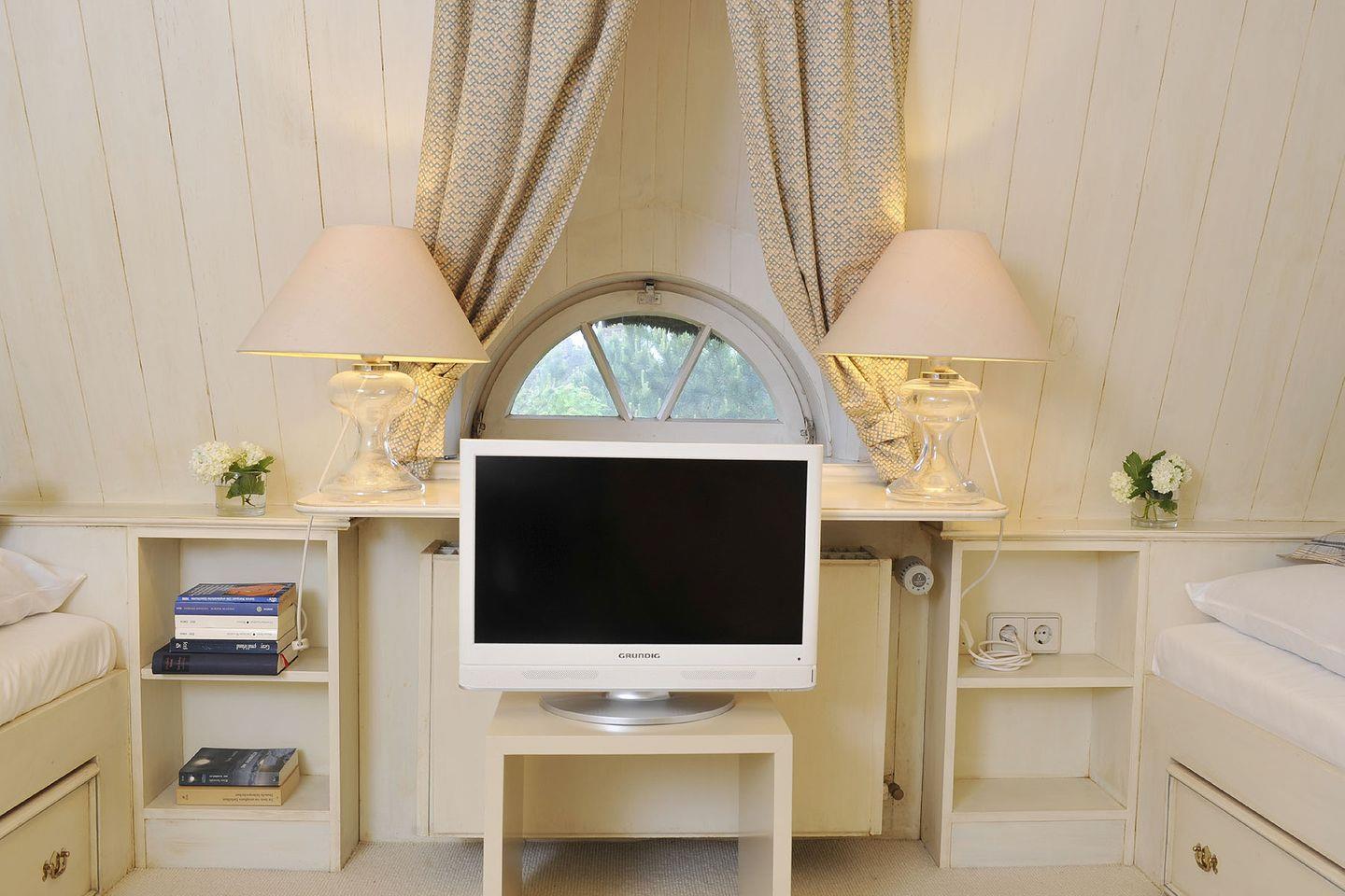 Spitzgiebel: Schlafzimmer mit 2 getrennt stehenden Einzelbetten, Waschbecken
