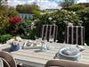Erdgeschoss: Wohn- und Essbereich, offene komplett ausgestattete Küche; Südost-Terrasse mit Gartenmöbeln