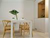 Das exklusive 4-Sterne Ferien Domizil Stutenhof 15 liegt am Gurtstig mitten in Keitum. Im 1. Obergeschoss ist alles auf einer Ebene zusammengefügt und bietet auf 40 m² Platz für ein oder zwei Personen zum Schlafen, Essen, Wohnen und Leben. Das Ferien Domizil wurde im Jahr 2018 umfassend renoviert und ist puristisch und reduziert eingerichtet. In der gesamten Wohnung befinden sich hochwertige Tischlerarbeiten. Eine besondere Atmosphäre schaffen die als Bodenbelag verwendeten handgefertigten Originalnachbildungen antiker Marmor- und Kalksteinplatten – Castle Stones Platten. Das Bad glänzt mit hochwertigen Sanitärobjekten von Laufen und Armaturen und einer Regendusche von Dornbracht. Der offene Schlafraum ist mit einem exklusiven Treca Bett ausgestattet. Im Wohnraum mit integrierter Teeküche befindet sich ein großer Tisch mit Y-Chairs von Hans Wegner/Tondern und einem Sofa. Die kleine Küche ist ausgestattet mit Produkten der Firmen Gunther Lambert und Le Creuset. Da bewusst mit wenig Stoffen gearbeitet wurde, eignet sich die Wohnung sehr gut für Allergiker. Sie erhält durch einen separaten Eingang den Charme und den Charakter eines eigenen Hauses. Der Sitzplatz vor dem Haus wartet auf mit einem wunderbaren Blick auf den Randershof. Im hinteren Teil des Gartens lädt eine Liegefläche zum Verweilen ein.
