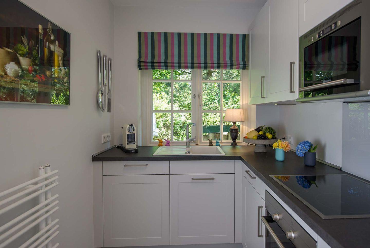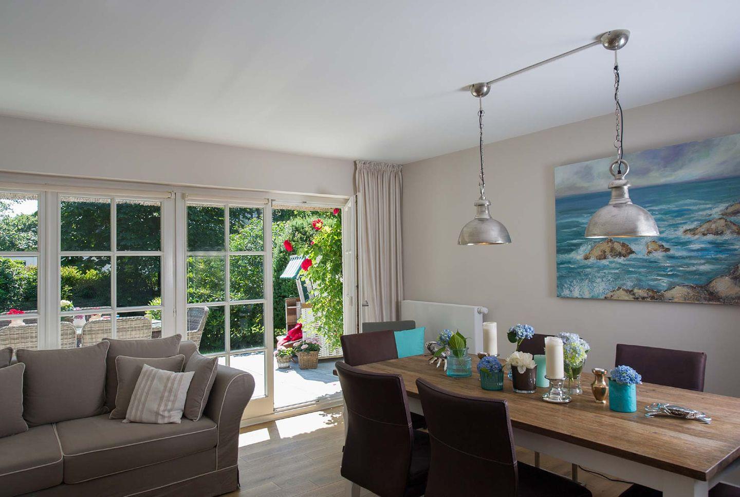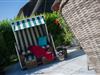 Erdgeschoss: Flur, komplett eingerichtete, separate Küche mit Nespresso-Maschine und Waschmaschine, Badezimmer mit Dusche und WC, Wohnzimmer mit Esstisch, Kamin und TV, eingewachsener, ruhiger Garten, Südwest-Terrasse mit Gartenmöbeln und Strandkorb