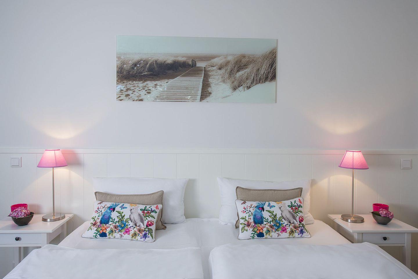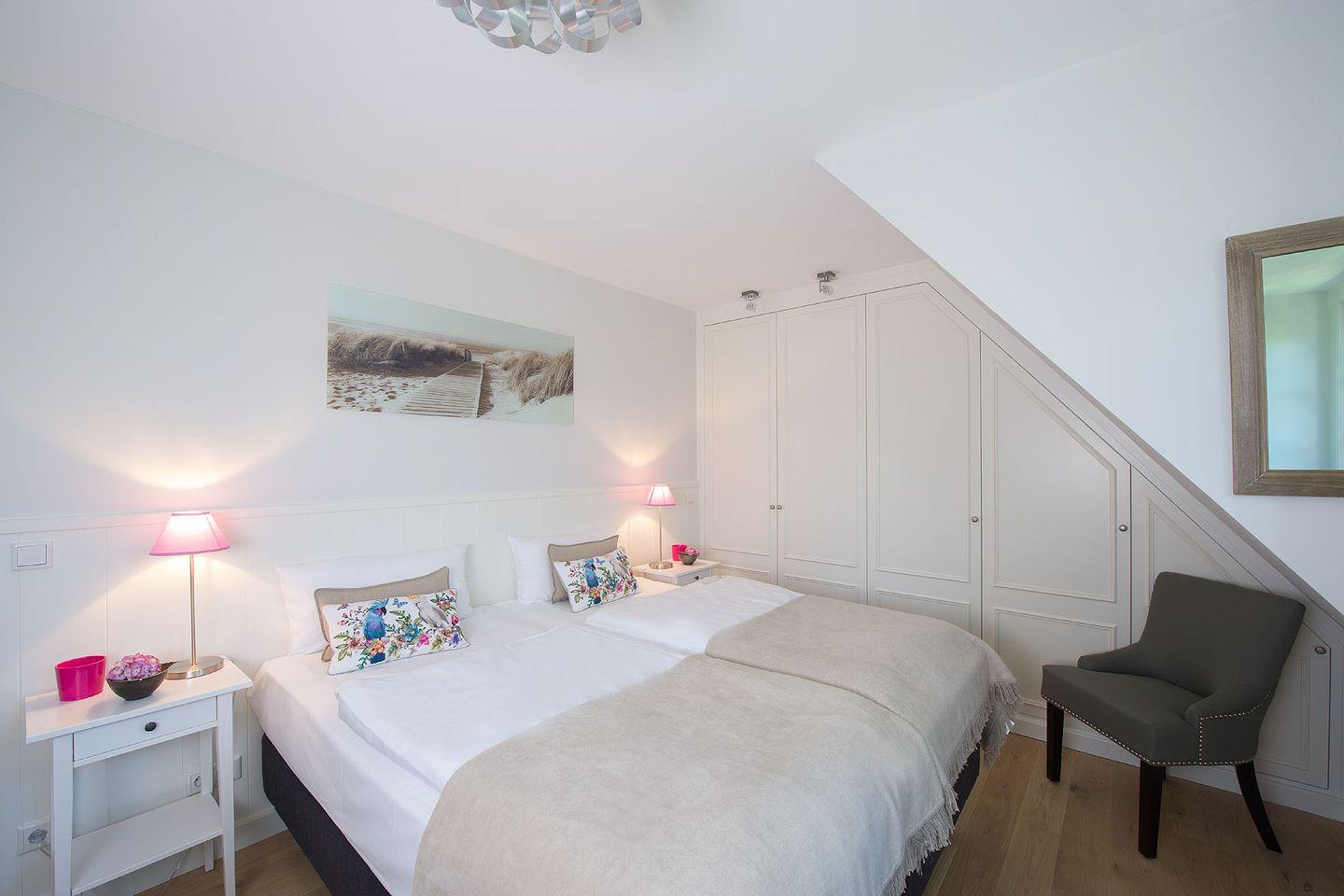 Das exklusive 5-Sterne Ferien Domizil im Lörkiwai 7 in Keitum bietet auf zwei Ebenen und 100 m² ausreichend Platz für maximal vier Personen. Große Fensterfronten im luftigen Wohnbereich mit großem Esstisch und gemütlicher Couch öffnen die Wohnung hin zu den Sonnenplätzen auf der Terrasse und dem 250 m² großen, eingewachsenen Garten. Die schönsten Farben, die der Sommer auf der Insel zu bieten hat, bereiten einen warmen Empfang im Eingangsbereich. Angesichts der maritimen Bildmotive verfällt man unwillkürlich in Strandlaune. Warme Beigetöne wurden im Wohnbereich und in den Schlafräumen im Obergeschoss mit angenehmen Pastelltönen wie Rosa und Mint bis hin zu kraftvollen Farben wie Türkis und Kornblumenblau kombiniert. Dadurch entsteht eine behagliche Wohnatmosphäre. Zwei moderne Bäder, eines davon mit integrierter Sauna, bieten Wellnessvergnügen und Komfort. Am Abend oder an kühleren Tagen findet man vor dem Kamin einen schönen Platz zur Entspannung bei einem guten Essen oder anregenden Gesprächen. Das Ferien Domizil Lörkiwai 7 liegt in unmittelbarer Nähe zum Benen-Diken-Hof und ist aufgrund seiner besonderen Lage ein idealer Ausgangspunkt, um das ursprüngliche und das moderne Keitum samt seiner Flaniermeile zu erkunden.