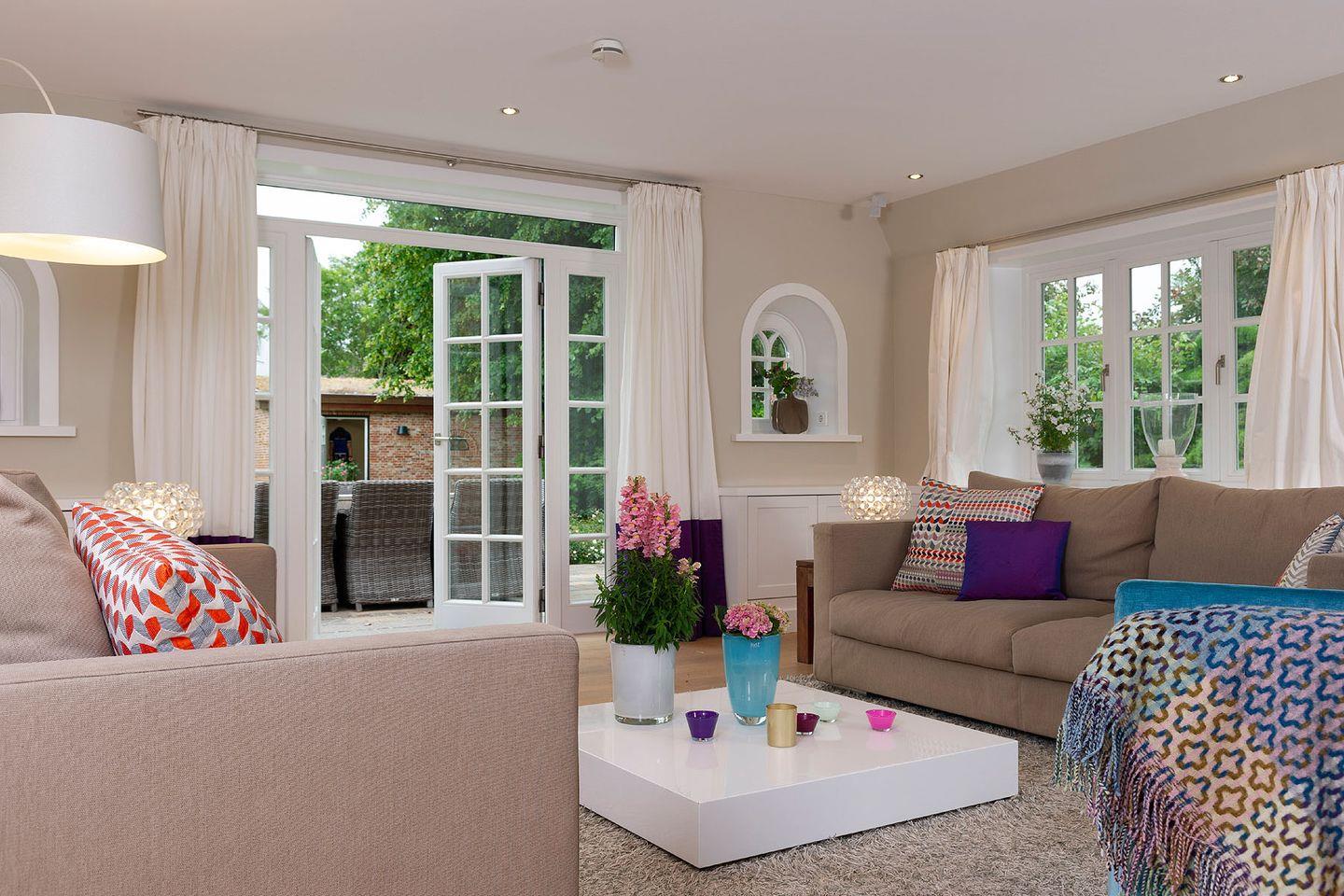 Eine Mischung aus Luxus, Lässigkeit und Modernität prägt das stylische Ambiente des Hauses. So finden sich mutige Farben wie Grasgrün, Pink, Lila und Türkis in Designer-Kissen, Wandfarbe, dem Geschirr von Dibbern und ausgesuchten, liebevollen Dekorationen wieder. Für die Inneneinrichtung wurden nur hochwertige Materialien verwendet und besondere Designdetails wie moderne Foscarini Lampen oder Side Chairs von Charles Eames ausgewählt.