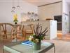 Im offenen Wohn- und Essbereich des Erdgeschosses befindet sich ein sympathisches Ensemble aus gemütlichem Sofa, Vintage-Sesseln und einer runden Essgruppe. Die offene Küche ist mit ihrer modernen Ausstattung ideal geeignet für ein gemeinsames Kochvergnügen. An kalten Tagen spendet ein Kaminofen angenehme Wärme. Nach ausgiebigen Ausflügen auf der Insel bietet eine im modernen Bad des Erdgeschosses integrierte Sauna Raum für wunderbare Wellness-Momente.