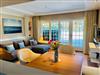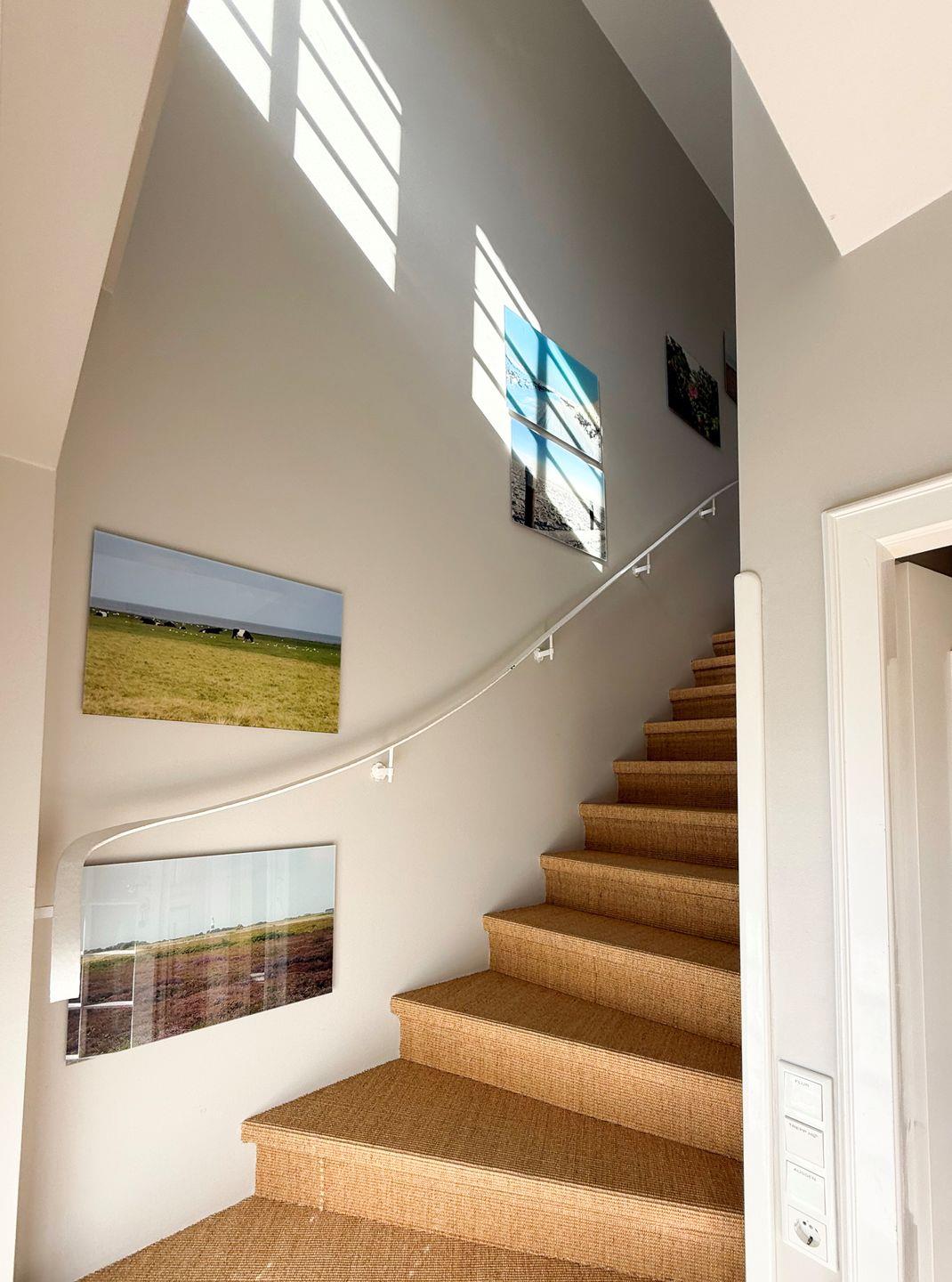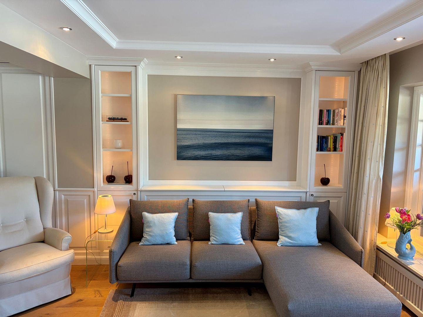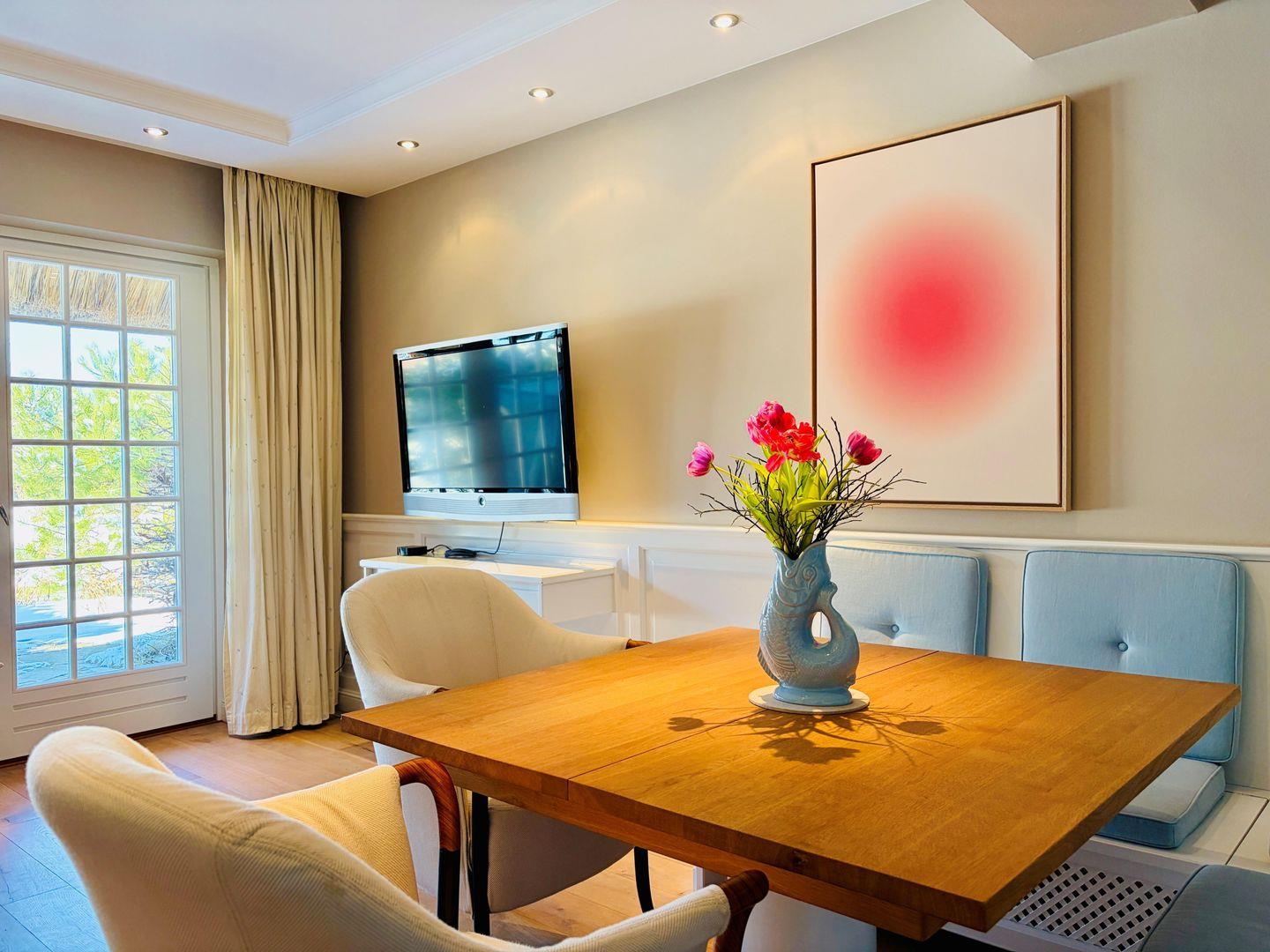 Die stilvolle Einrichtung in Sand-, Blau- und Koralltönen schafft eine ruhige, elegante Atmosphäre mit maritimem Flair. Der offene Wohn- und Essbereich mit moderner Küche lädt zum Entspannen und geselligen Beisammensein ein; eine Schiebetür ermöglicht bei Bedarf eine optische Trennung. Landschaftsfotografien von Sylt unterstreichen die Verbundenheit zur Insel und bringen nordischen Flair ins Haus.