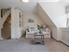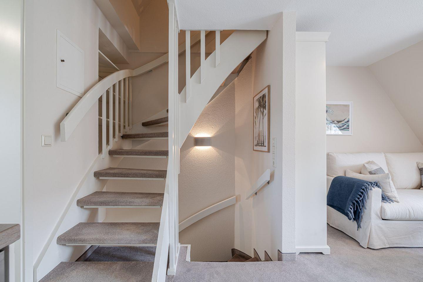 Über eine Treppe gelangen Sie ins behagliche Schlafzimmer im Dachgeschoss. Mit seinen schrägen Wänden, der niedrigen Decke und dem Dachfenster wirkt es fast wie eine kleine Kajüte – ein Platz zum Entspannen, Lesen und Ausschlafen.
