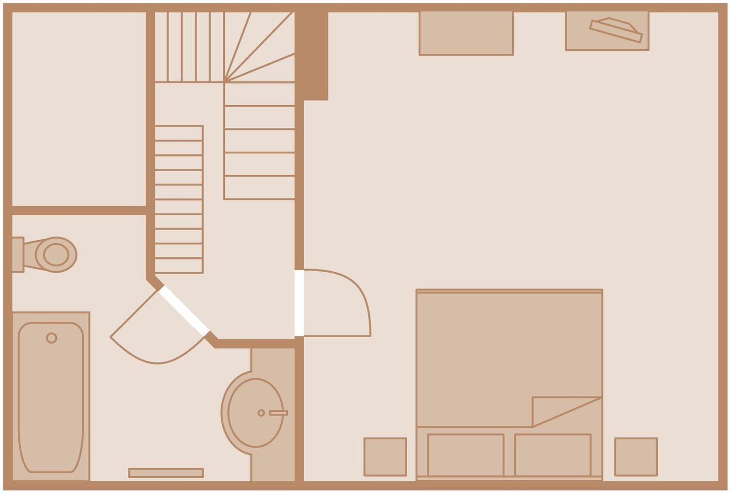 Obergeschoss: 1 Doppelzimmer mit TV, Badezimmer mit Badewanne und WC