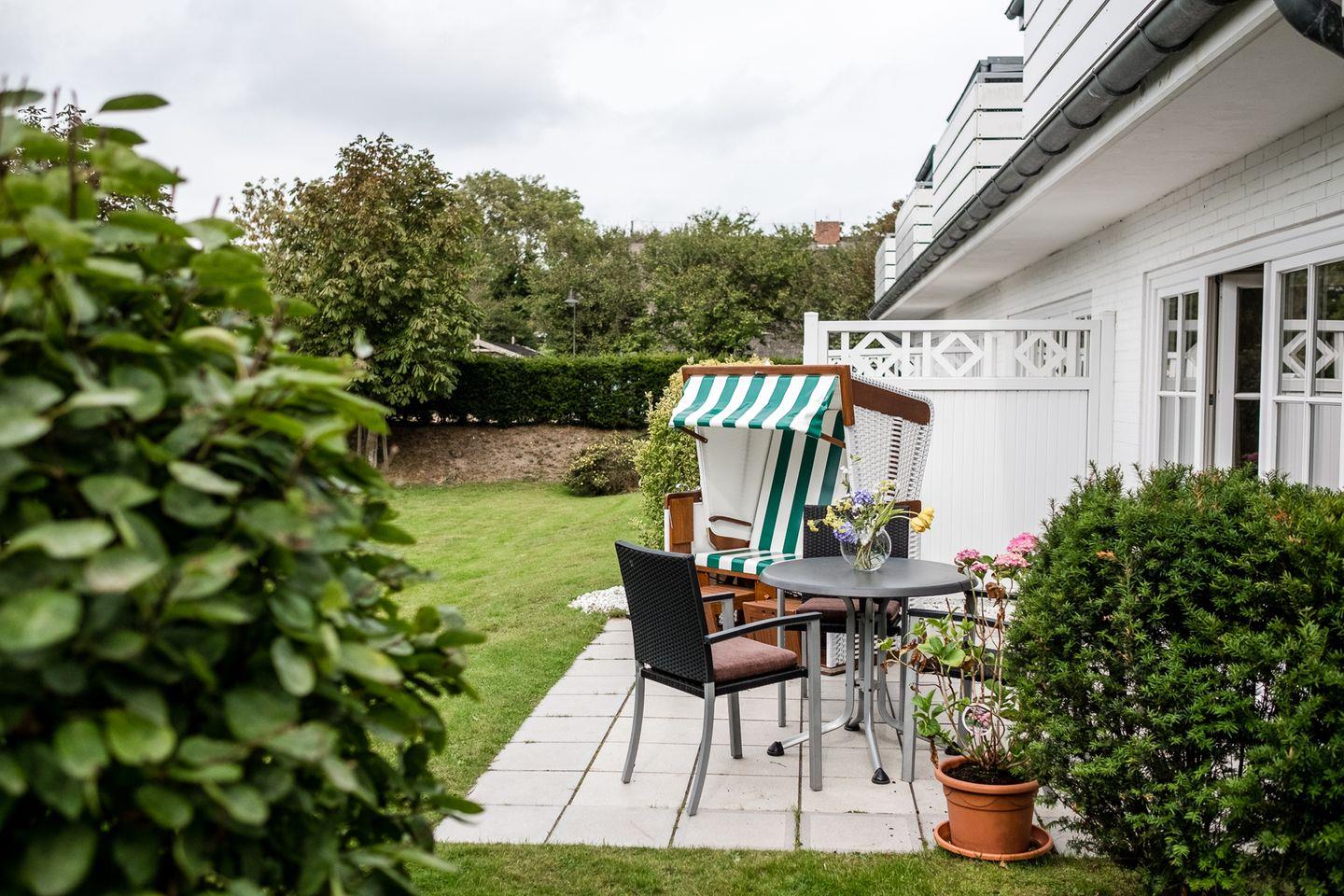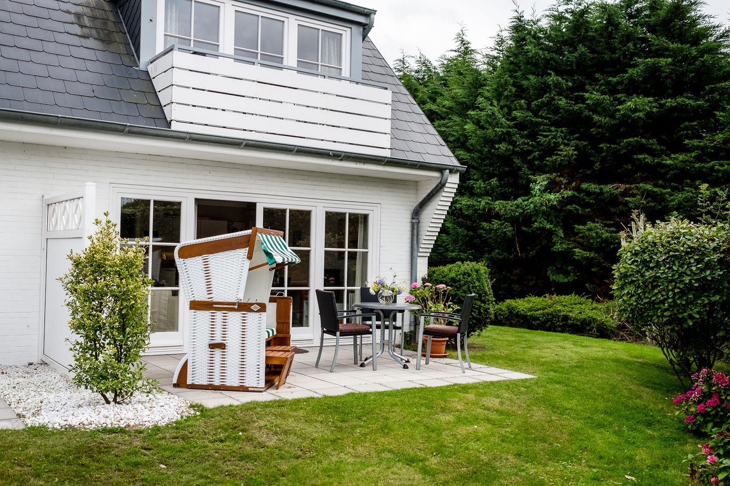 Ein besonderes Highlight ist die möblierte Terrasse (Gartensaison), auf der Sie sonnige Stunden im Freien genießen können. In der Gartensaison wartet hier zudem ein typischer Sylter Strandkorb – perfekt für den ersten Kaffee am Morgen oder einen entspannten Ausklang am Abend.