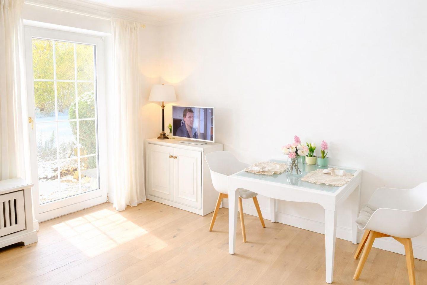 Schon beim Eintreten spürst du die harmonische Verbindung aus Gemütlichkeit und nordischem Charme. Das separate Schlafzimmer mit komfortablem Doppelbett (180 x 200 cm) verspricht erholsame Nächte, während der geschmackvoll gestaltete Wohnbereich mit Sofa, Sessel, Essplatz und digitalem TV ideale Voraussetzungen für entspannte Abende bietet. Selbstverständlich steht dir kostenfreies WLAN zur Verfügung. Praktische Details wie Ganzkörperspiegel, Garderobe, Wäscheständer und vieles mehr machen deinen Aufenthalt besonders angenehm.