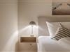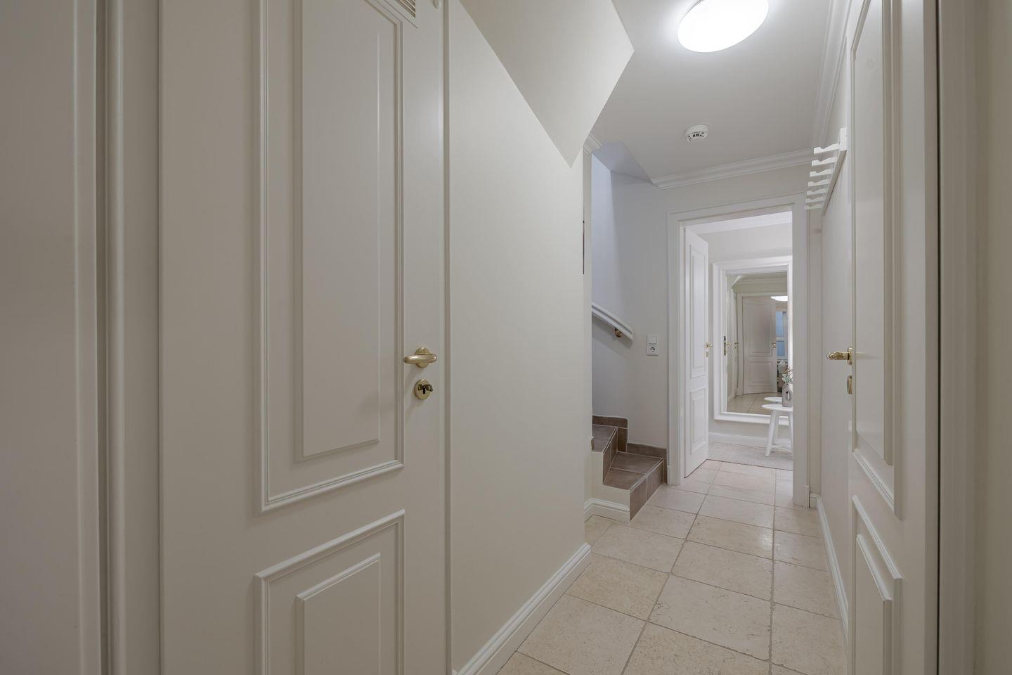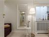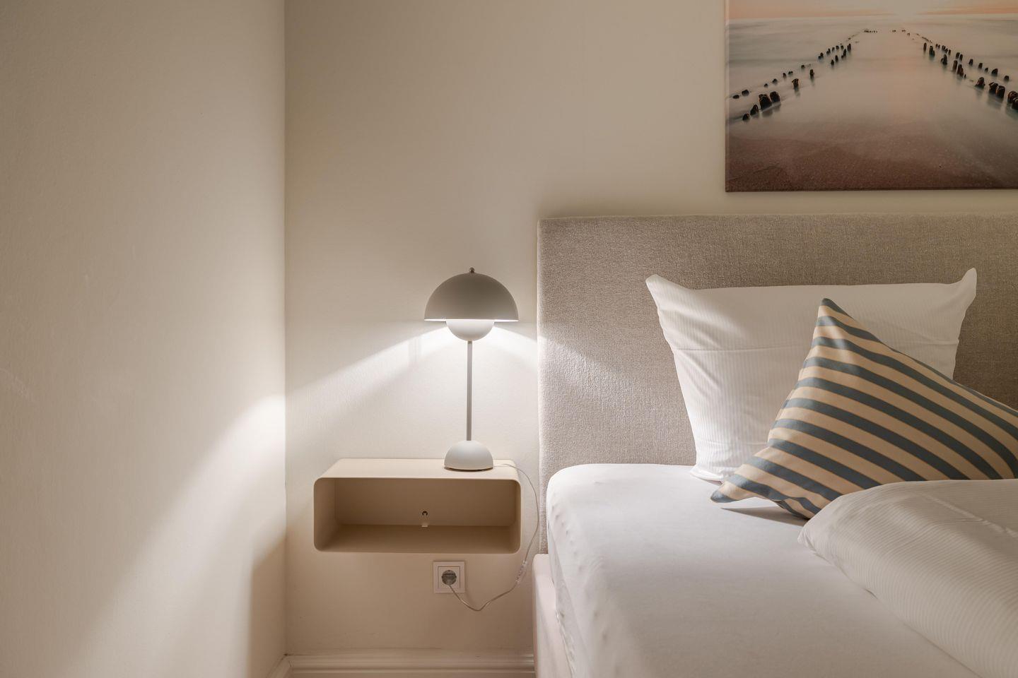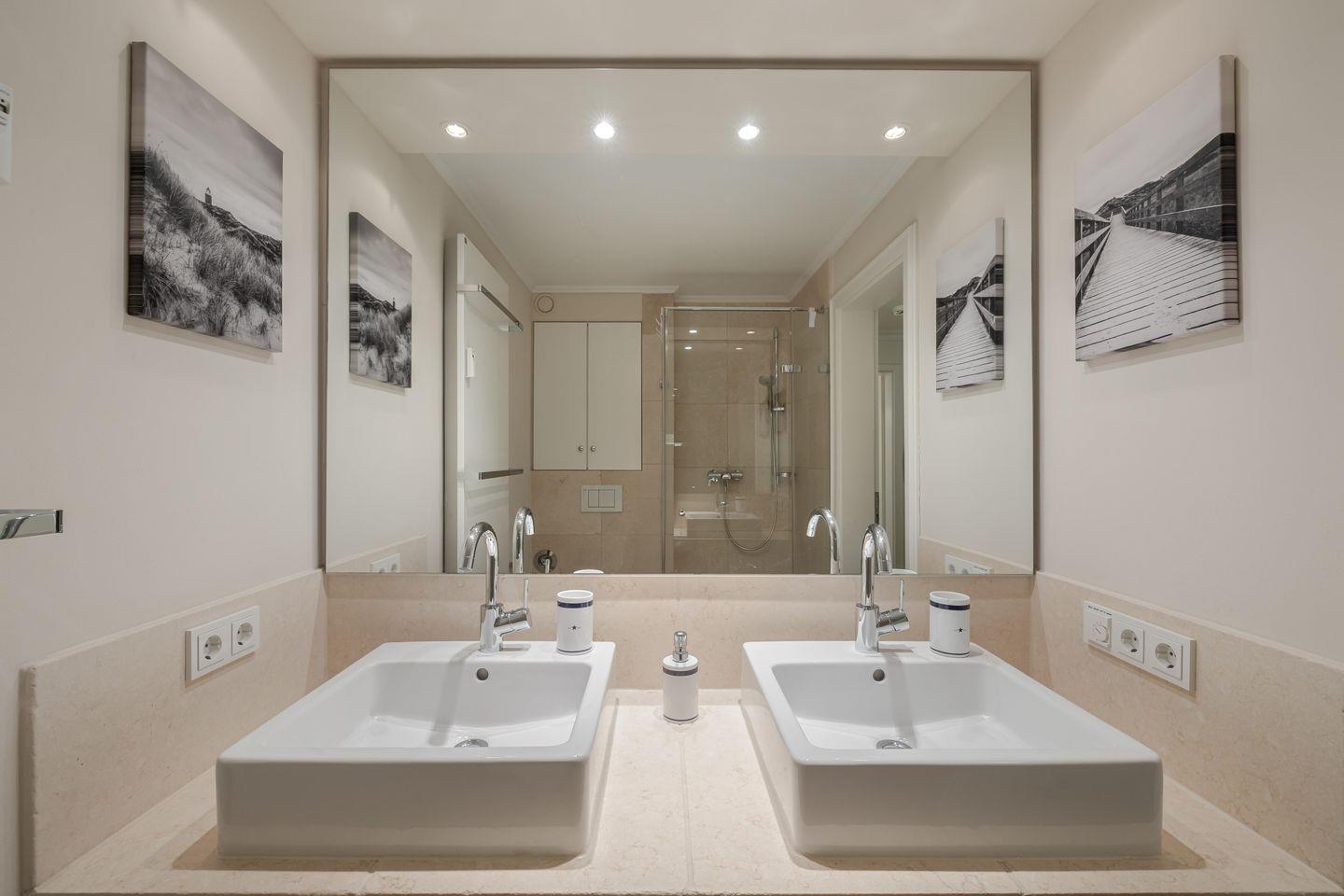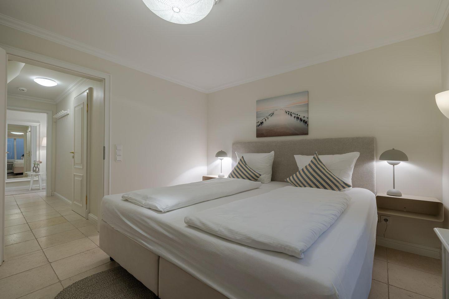 Eine Treppe tiefer liegt das Schlafzimmer mit seinem gemütlichen Boxspringbett. Gleich daneben präsentiert sich das Bad in dem cremefarbener Naturstein die Füße umschmeichelt und ein Doppelwaschtisch ausreichend Platz bietet. Den findet auch die Urlaubsgarderobe, denn es gibt ein großes Ankleidezimmer - wie gesagt, mit Lycka hat man eben Glück!