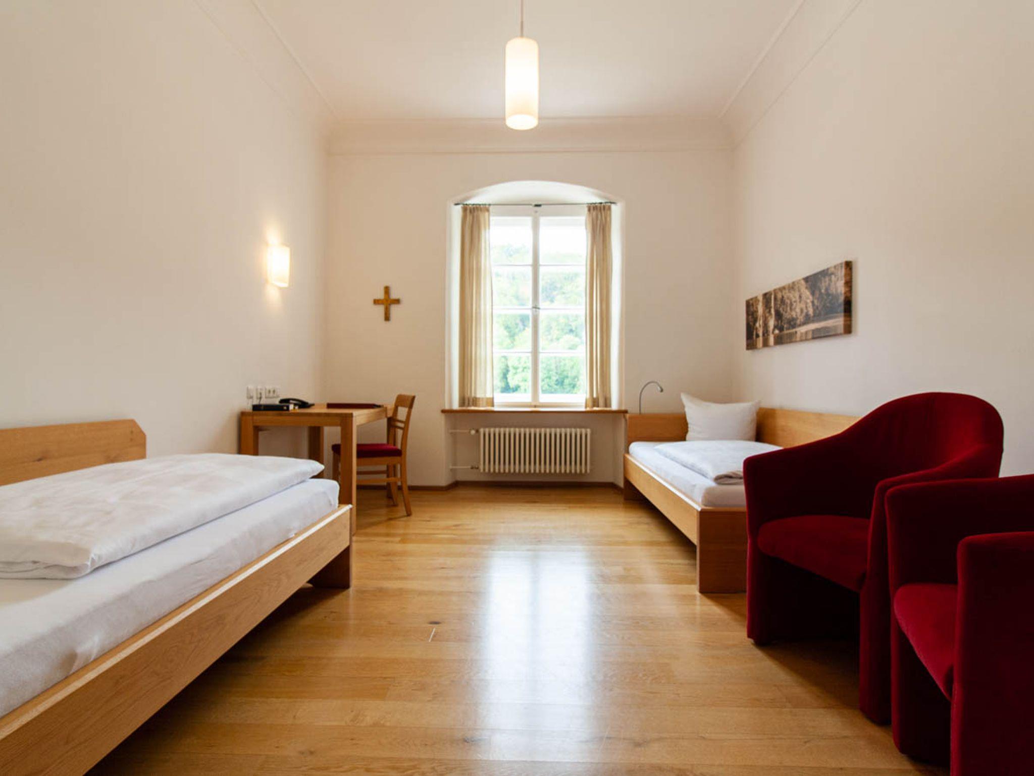 Mit der schlichten, soliden Ausstattung (Bett 90x200 cm, Schrank, Schreibtisch) in modernem Design, passen sich unsere Zweibettzimmer im Georgstrakt an die klösterliche Umgebung an. Auf persönlichen Komfort (Dusche, Toilette, Haartrockner, Handtuchheizkörper) und moderne Technik (Wifi, Direktwahltelefon) müssen Sie dennoch nicht verzichten.