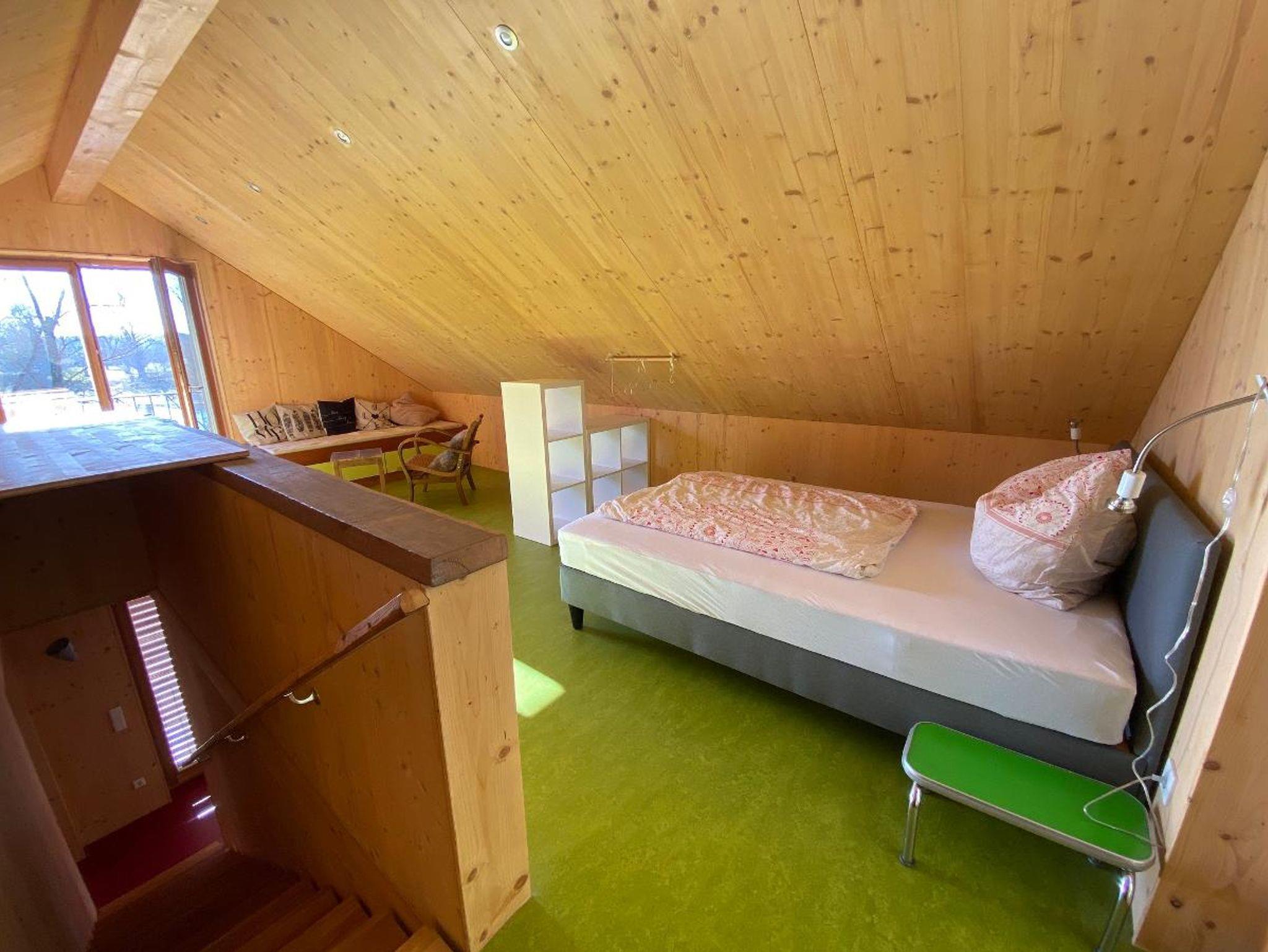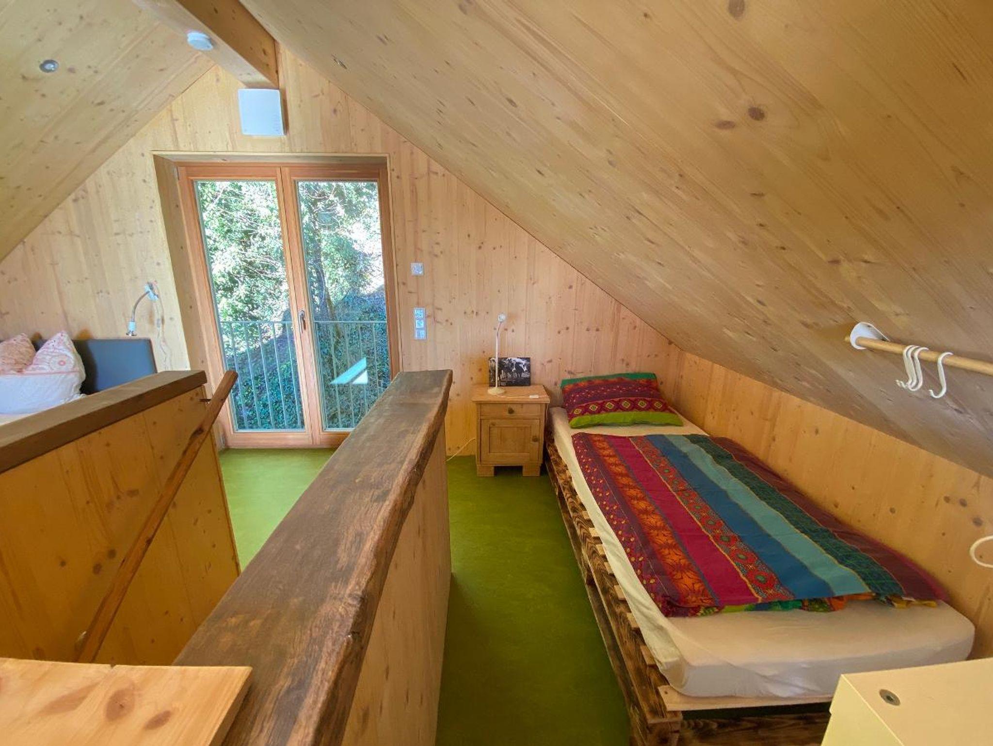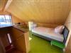 Im Erdgeschoss befinden sich der Koch-Essbereich und ein WC, im Obergeschoss der Wohnbereich, das Bad mit Dusche und ein kleines Schlafabteil mit Doppelbett. Im offenen Dachgeschoss stehen drei Einzelbetten mit Ablagemöglichkeiten.